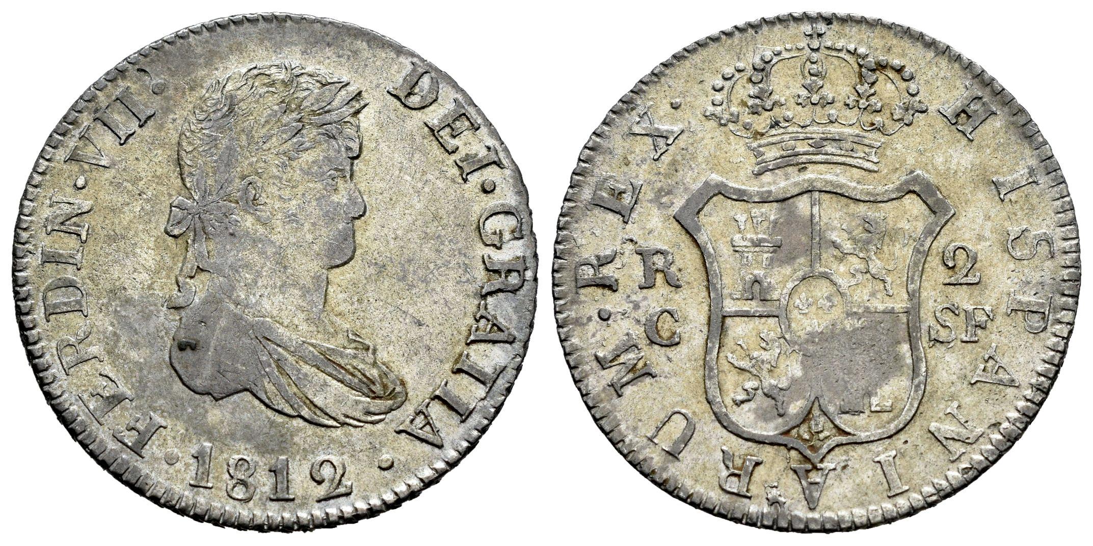 Fernando VII (1808-1833). 2 reales. 1812. Cataluña (Acuñada en Mallorca). SF. (Cal-766 var.). Ag. 5,54 g. Sin punto entre S y F. Escasa. MBC. Est...80,00.