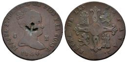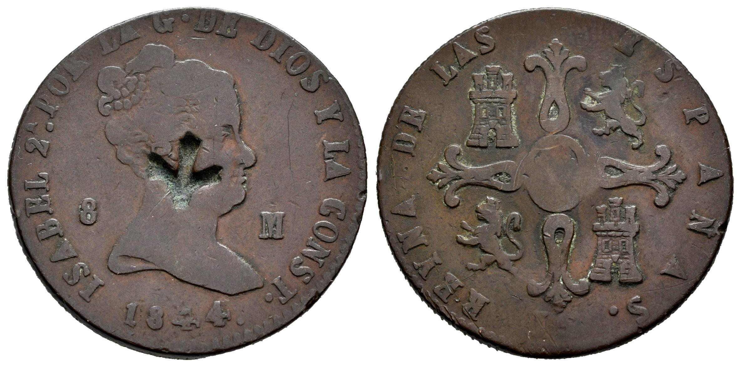 Isabel II (1833-1868). 8 maravedís. 1844. Jubia. (Cal-111). Ae. 9,90 g. Inusual contramarca en anverso con forma de ramillete floral. MBC-. Est...25,00.