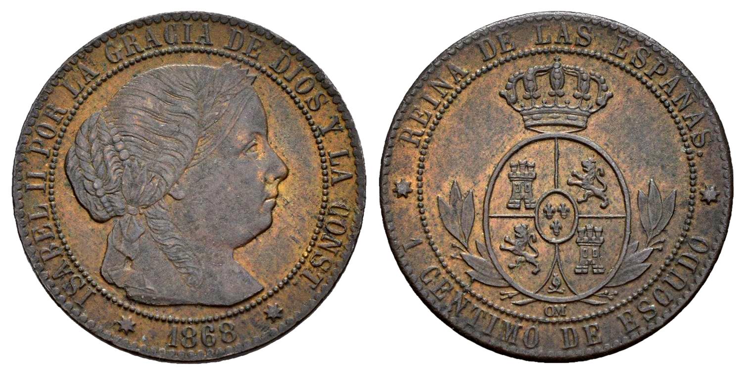 Isabel II (1833-1868). 1 céntimo de escudo. 1868. Sevilla. OM. (Cal-229). Ae. 2,44 g. MBC+/EBC-. Est...30,00.