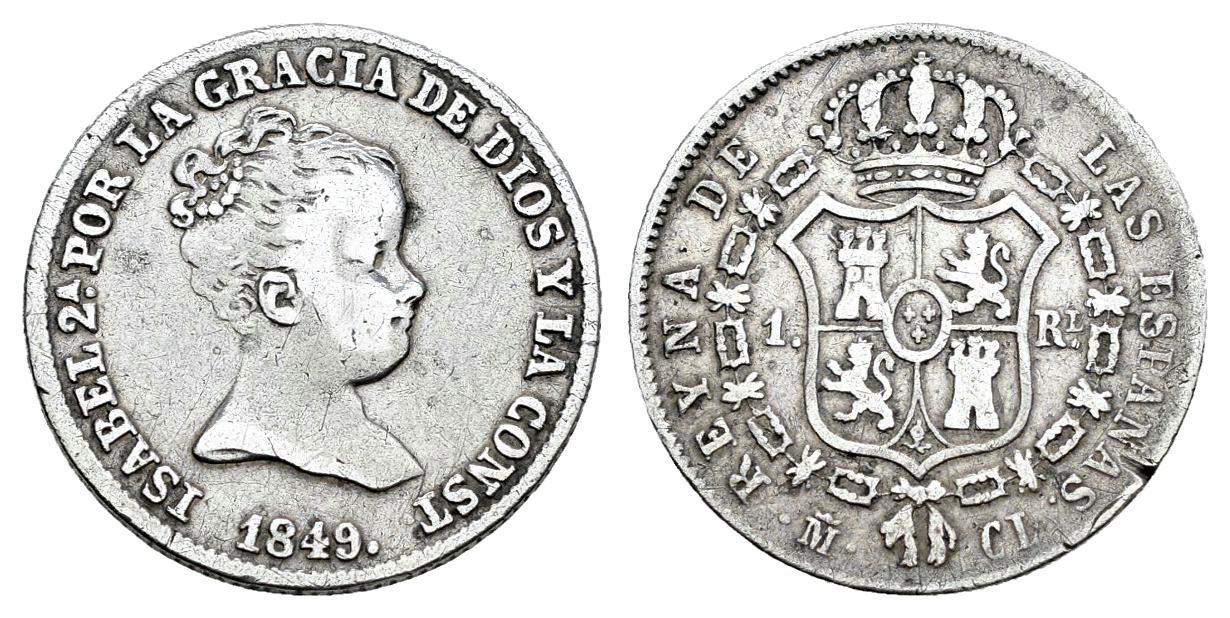 Isabel II (1833-1868). 1 real. 1849. Madrid. CL. (Cal-301). Ag. 1,23 g. Golpecito en el canto. Limpiada. MBC-. Est...25,00.