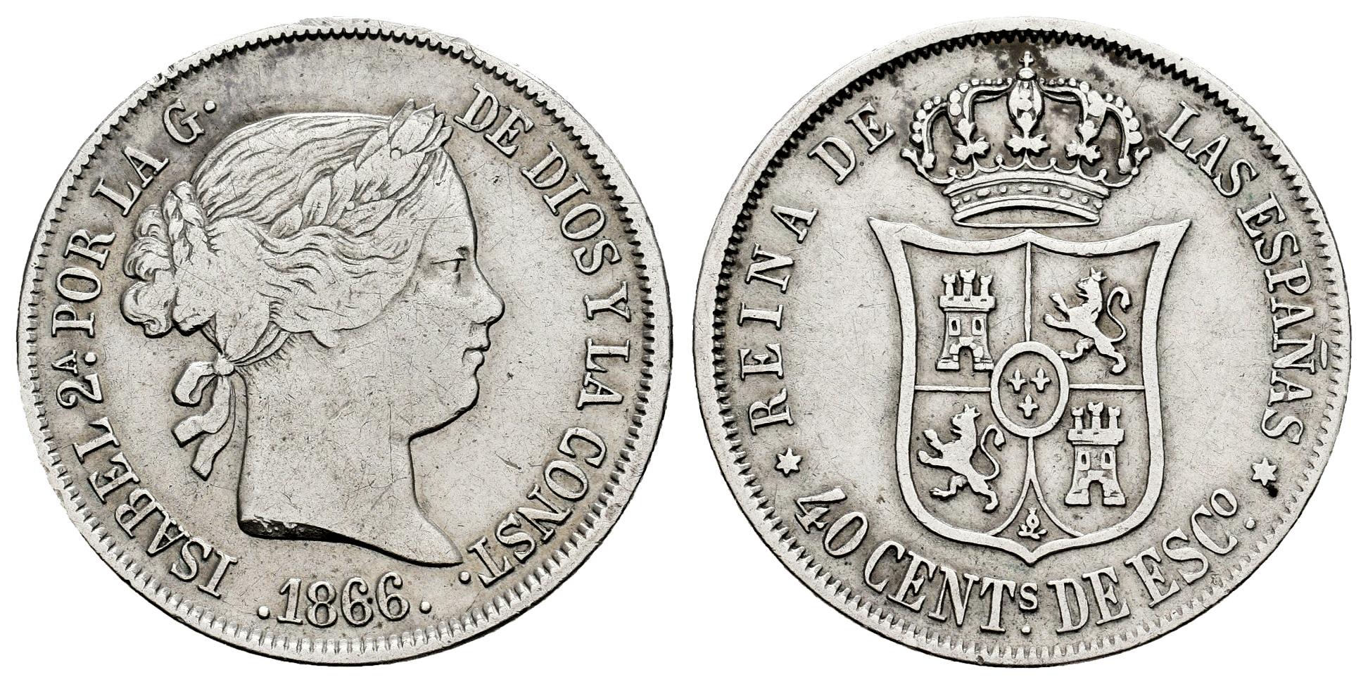 Isabel II (1833-1868). 40 céntimos de escudo. 1866. Madrid. (Cal-501). Ag. 5,17 g. Golpecito en canto. Limpiada. MBC-. Est...25,00.