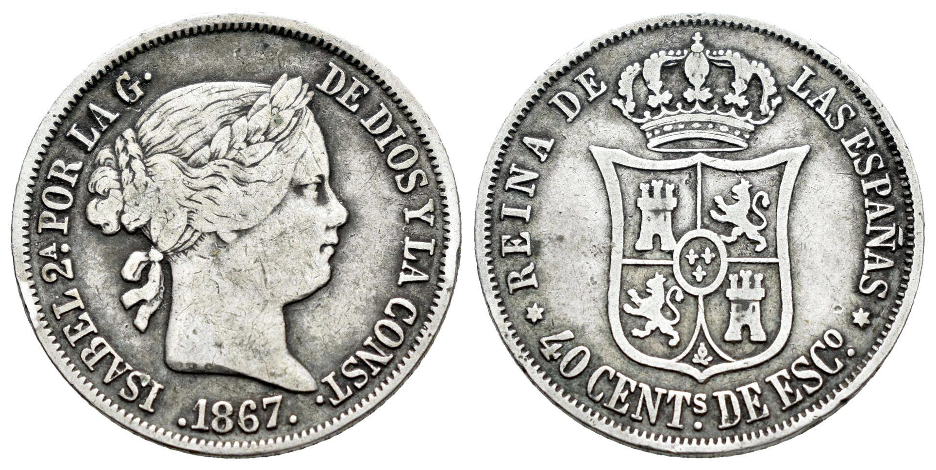 Isabel II (1833-1868). 40 céntimos de escudo. 1867. Madrid. (Cal-502). Ag. 5,09 g. BC+. Est...15,00.