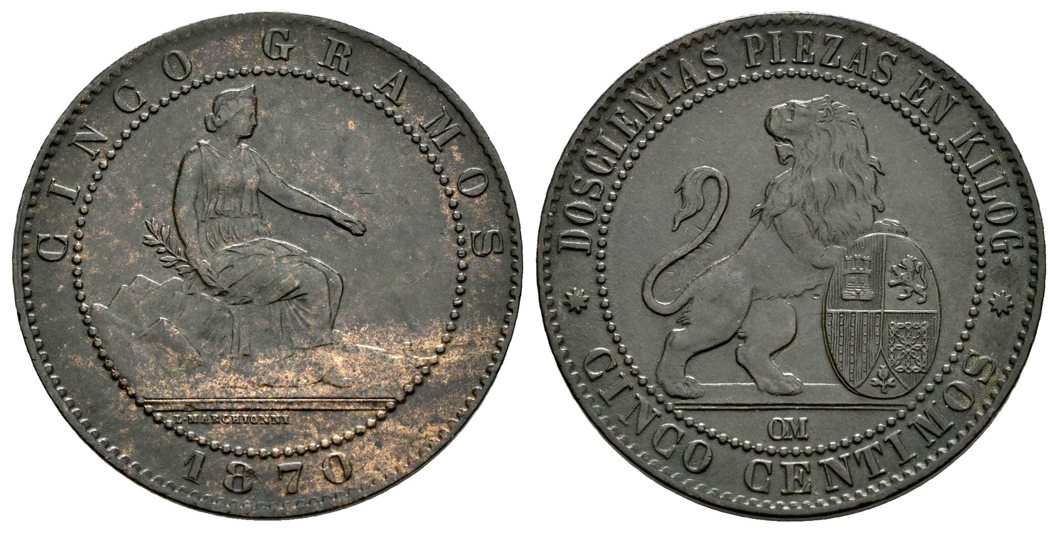 Centenario de la Peseta (1868-1931). Gobierno Provisional (1868-1871). 5 céntimos. 1870. Barcelona. OM. (Cal-5). Ae. 4,92 g. MBC+. Est...25,00.