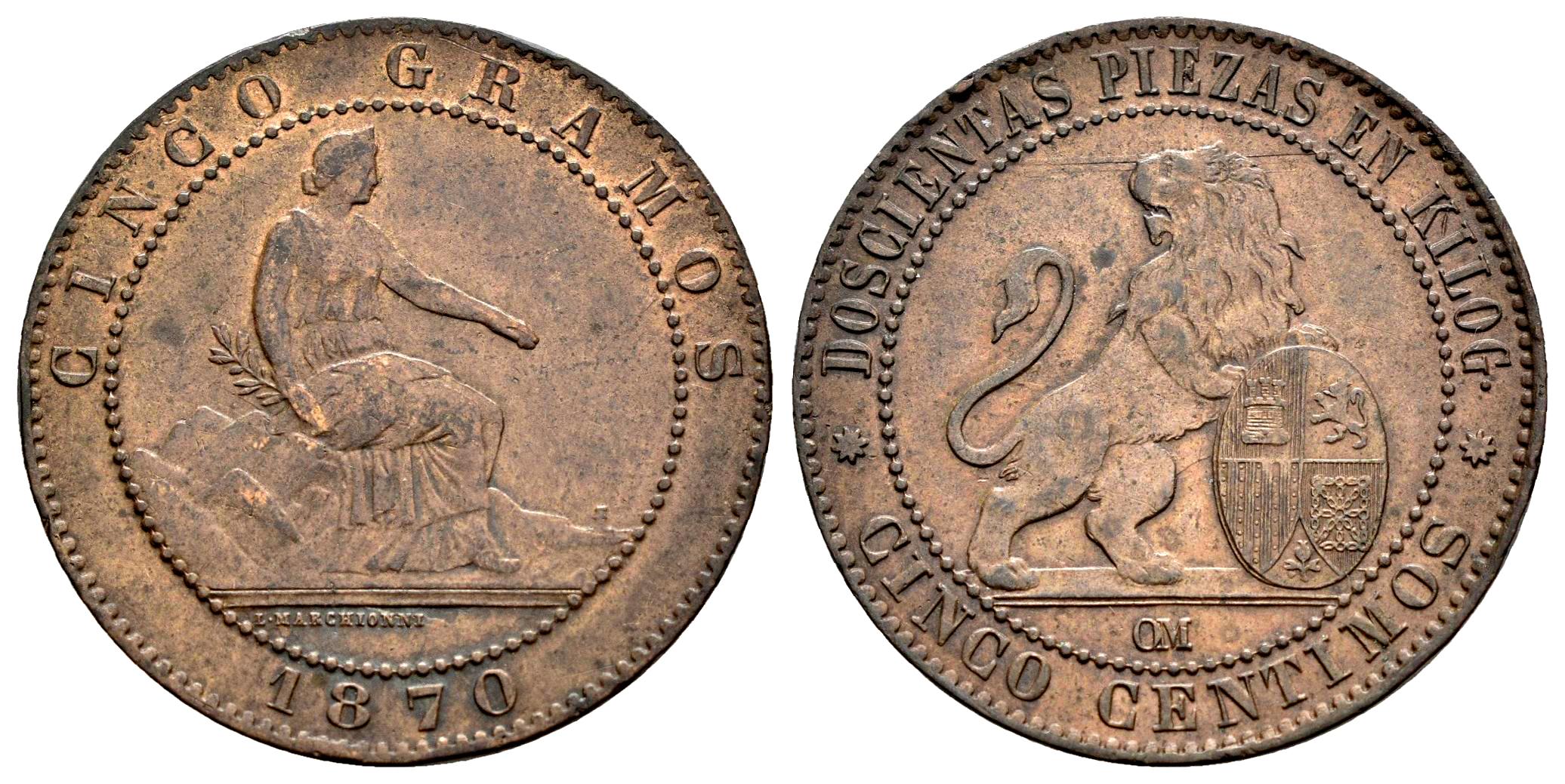Centenario de la Peseta (1868-1931). Gobierno Provisional (1868-1871). 5 céntimos. 1870. Barcelona. OM. (Cal-5). Ae. 4,60 g. MBC. Est...20,00.