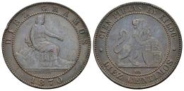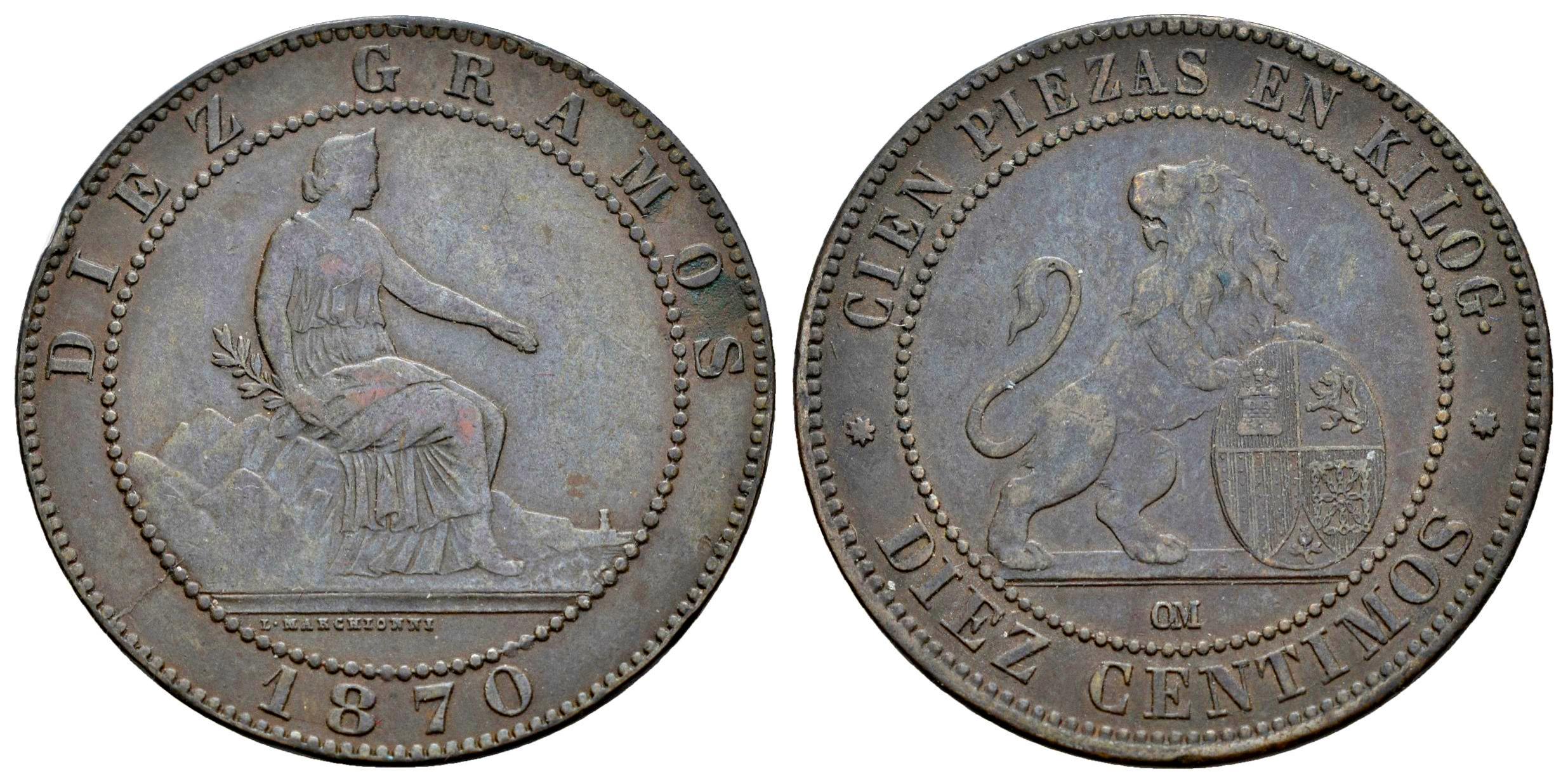 Centenario de la Peseta (1868-1931). Gobierno Provisional (1868-1871). 10 céntimos. 1870. Barcelona. OM. (Cal-8). Ae. 10,45 g. Golpe en el canto. MBC+. Est...60,00.