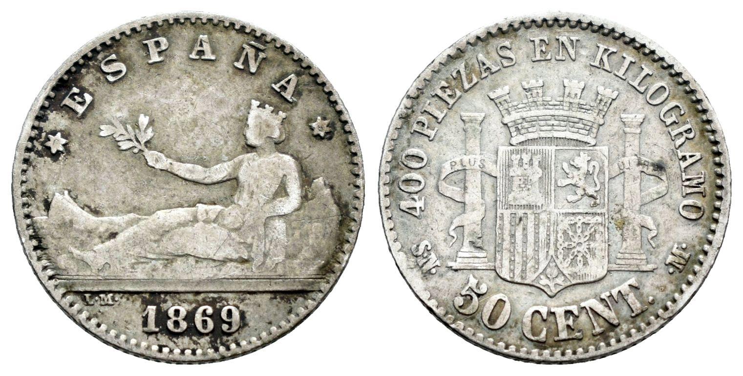 Centenario de la Peseta (1868-1931). Gobierno Provisional (1868-1871). 50 céntimos. 1869*6-9. Madrid. SNM. (Cal-13). Ag. 2,43 g. Golpe en el canto. BC. Est...20,00.