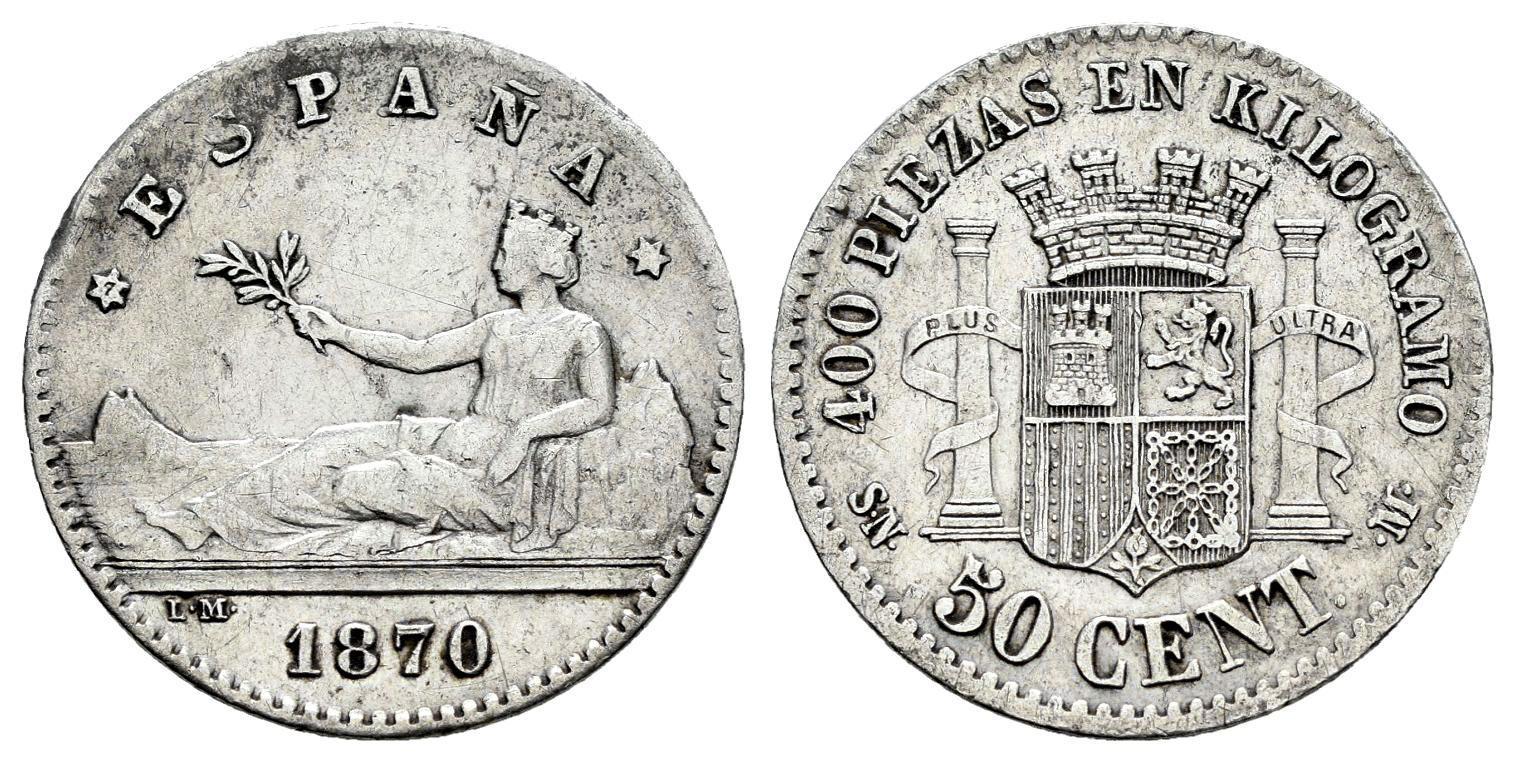 Centenario de la Peseta (1868-1931). Gobierno Provisional (1868-1871). 50 céntimos. 1870*7-_. Madrid. SNM. (Cal-15). Ag. 2,49 g. MBC-. Est...35,00.