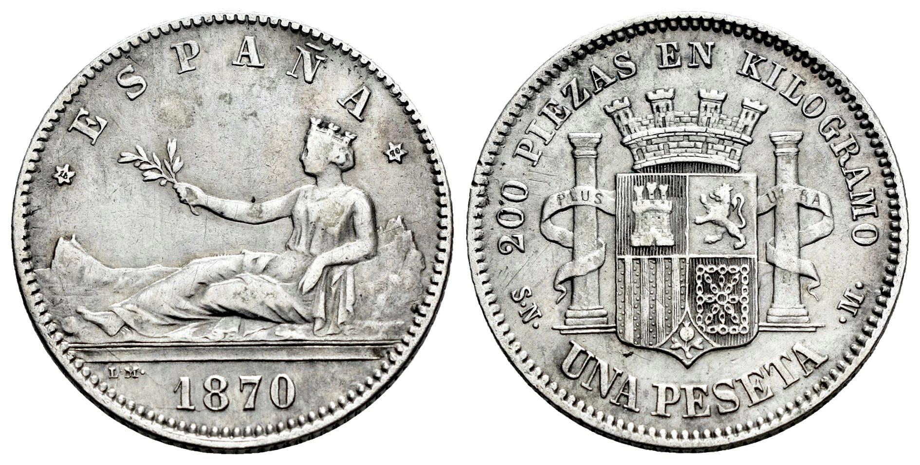 Centenario de la Peseta (1868-1931). Gobierno Provisional (1868-1871). 1 peseta. 1870*18-70. Madrid. SNM. (Cal-18). Ag. 47,94 g. Limpiada. MBC/MBC+. Est...90,00.
