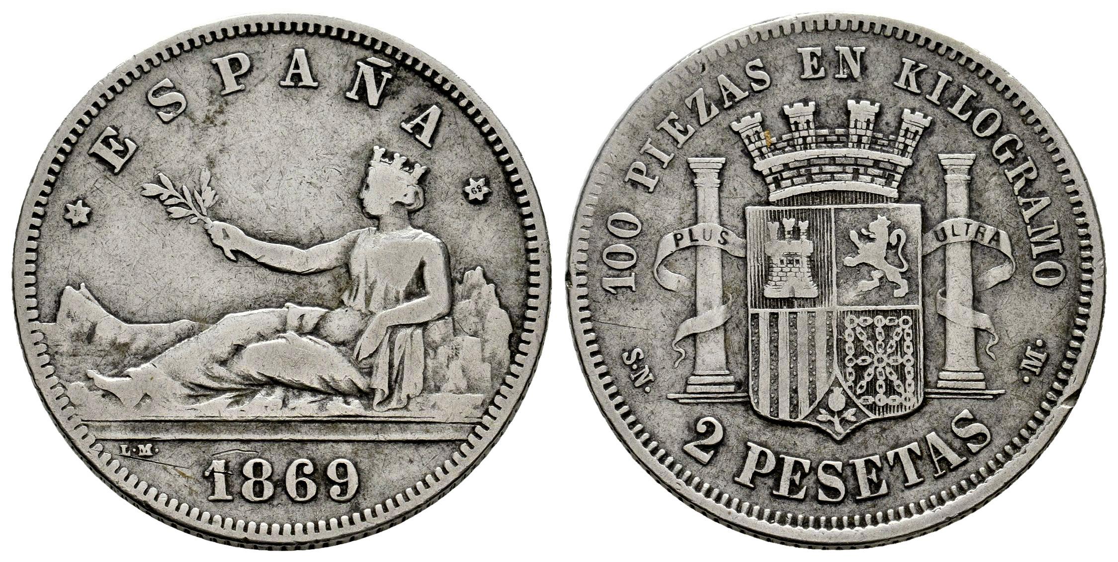 Centenario de la Peseta (1868-1931). Gobierno Provisional (1868-1871). 2 pesetas. 1869*1_-68. Madrid. SNM. (Cal-20). Ag. 9,88 g. Limpiada. MBC-. Est...35,00.