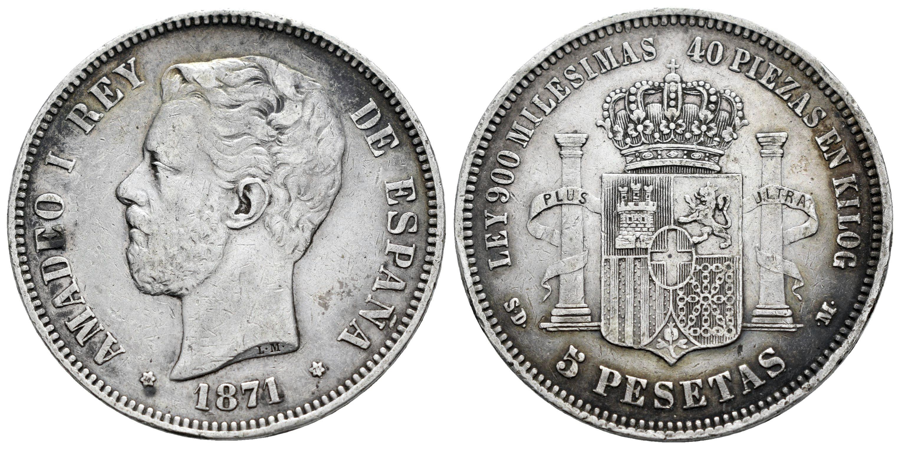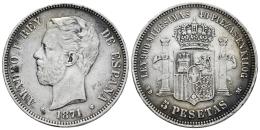 Centenario de la Peseta (1868-1931). Amadeo I (1871-1873). 5 pesetas. 1871 *18-71. Madrid. SDM. (Cal-1 var.). Ag. 24,96 g. Sin punto después de KILOG. Ligero tono. MBC. Est...60,00.