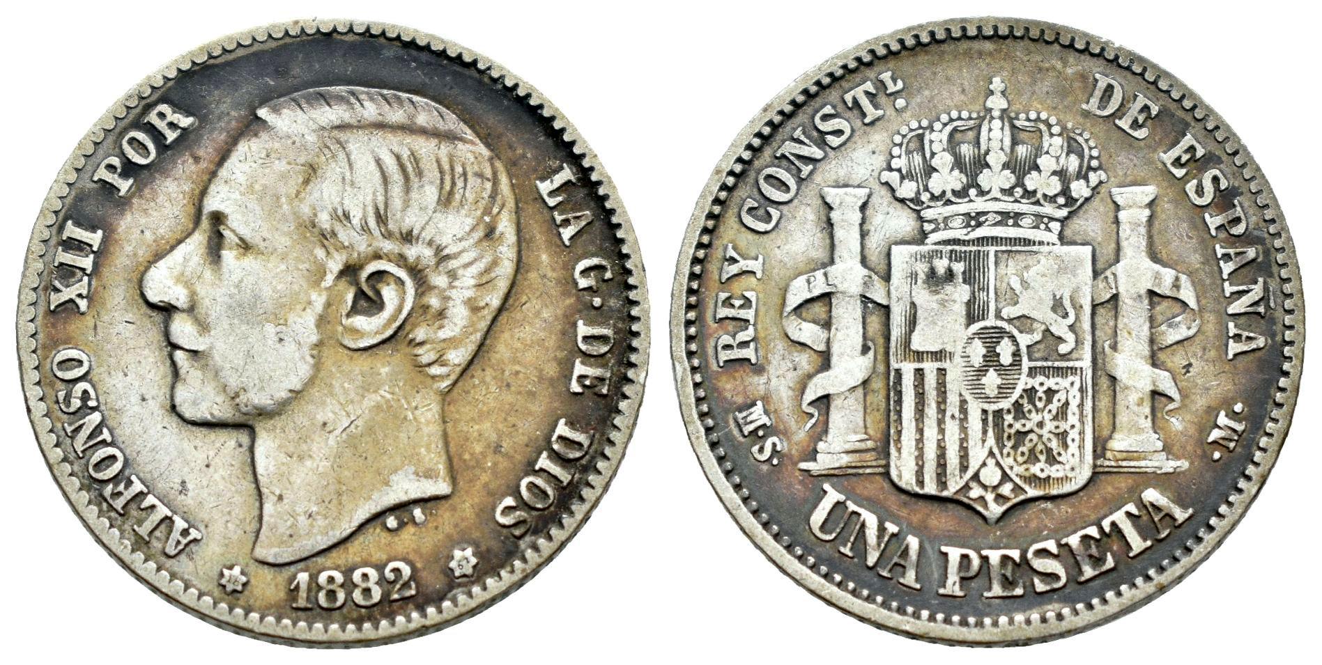 Centenario de la Peseta (1868-1931). Alfonso XII (1874-1885). 1 peseta. 1882*18-82. Madrid. MSM. (Cal-20). Ag. 4,93 g. Segunda estrella tenue. MBC-. Est...20,00.