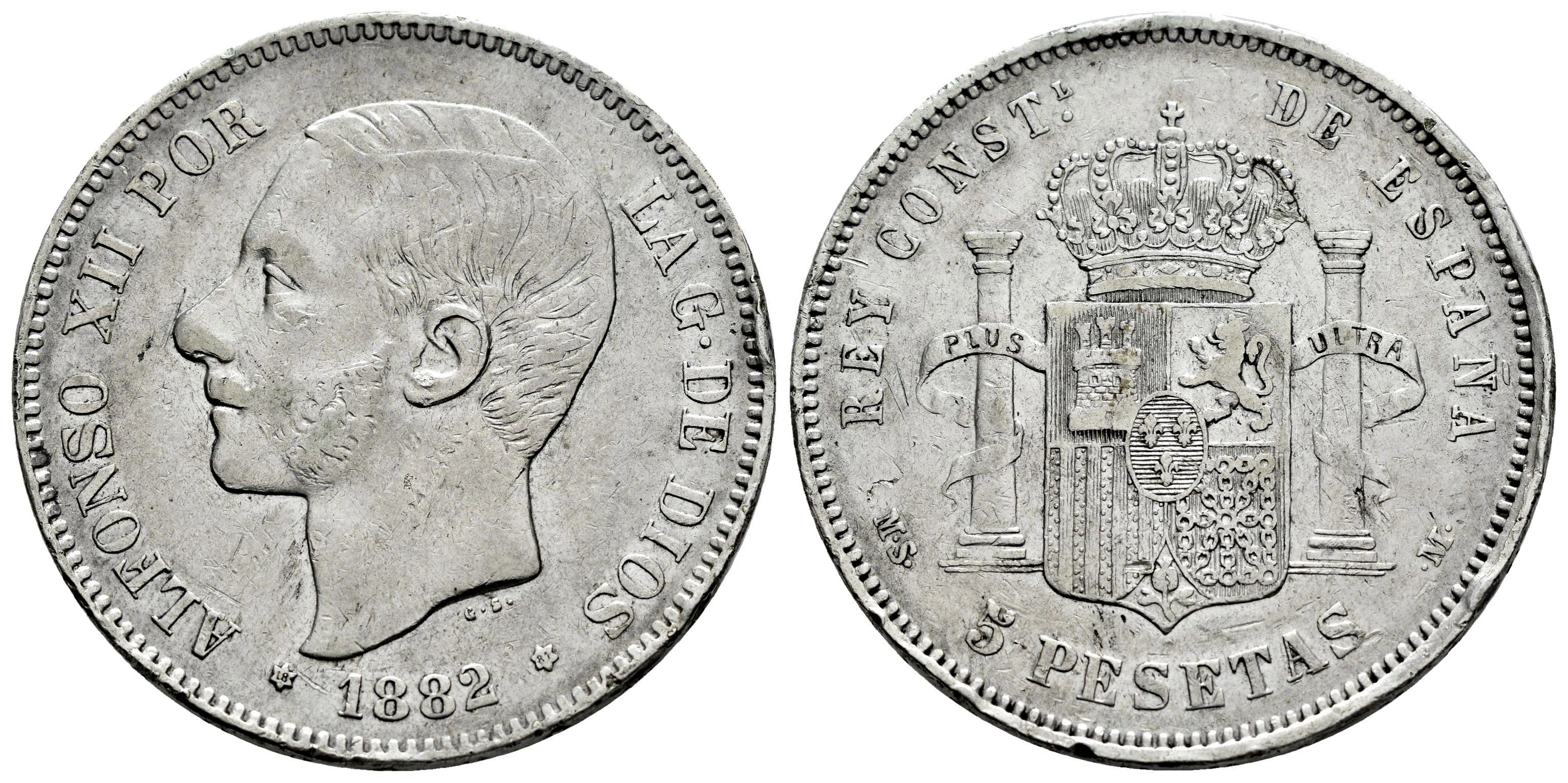 Centenario de la Peseta (1868-1931). Alfonso XII (1874-1885). 5 pesetas. 1882/1 *18-81. Madrid. MSM. (Cal-46). Ag. 24,80 g. Golpes. Escasa. MBC-. Est...50,00.