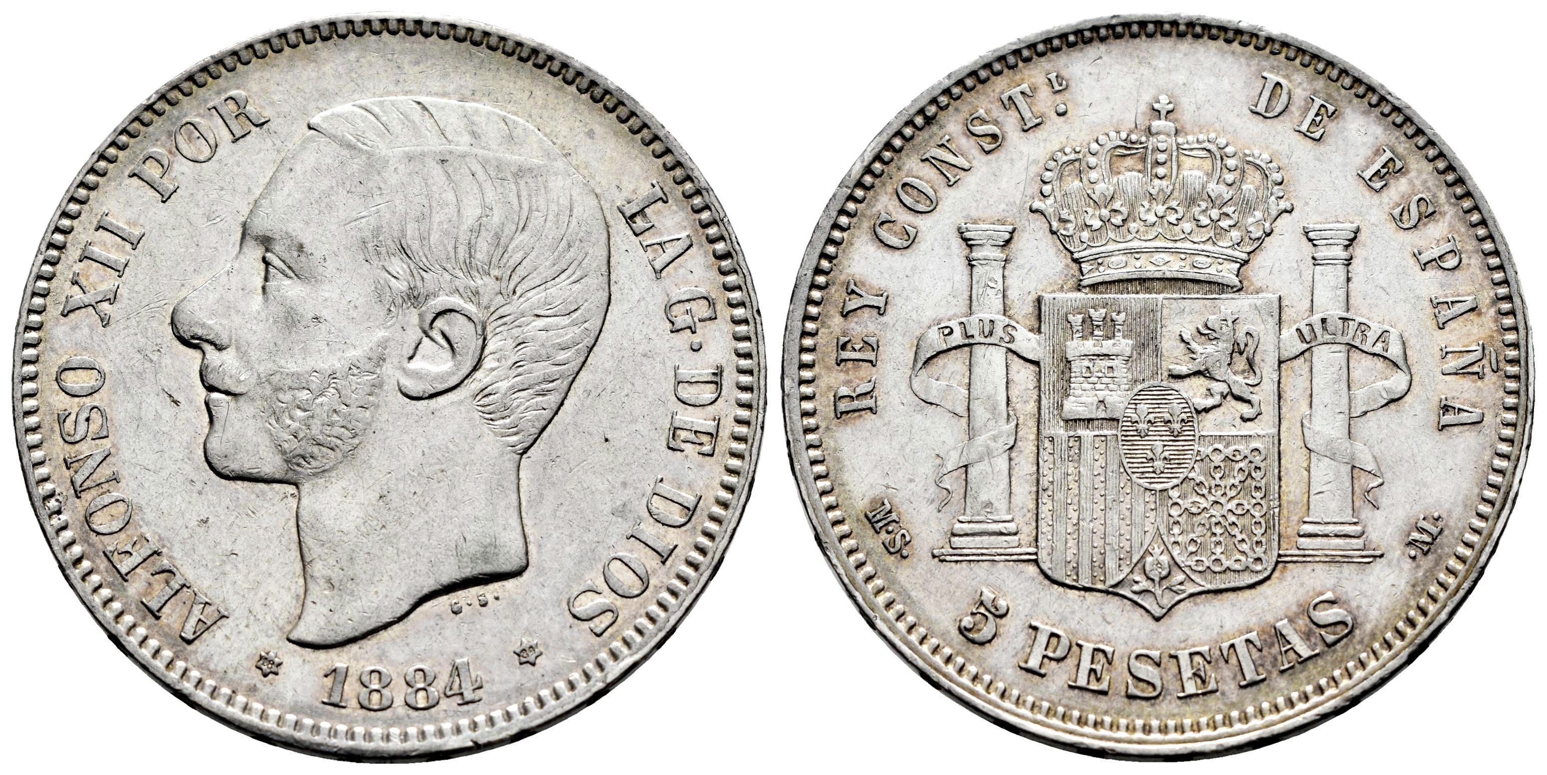 Centenario de la Peseta (1868-1931). Alfonso XII (1874-1885). 5 pesetas. 1884*18-84. Madrid. MSM. (Cal-57). Ag. 24,89 g. Marquitas. Limpiada. MBC+. Est...50,00.