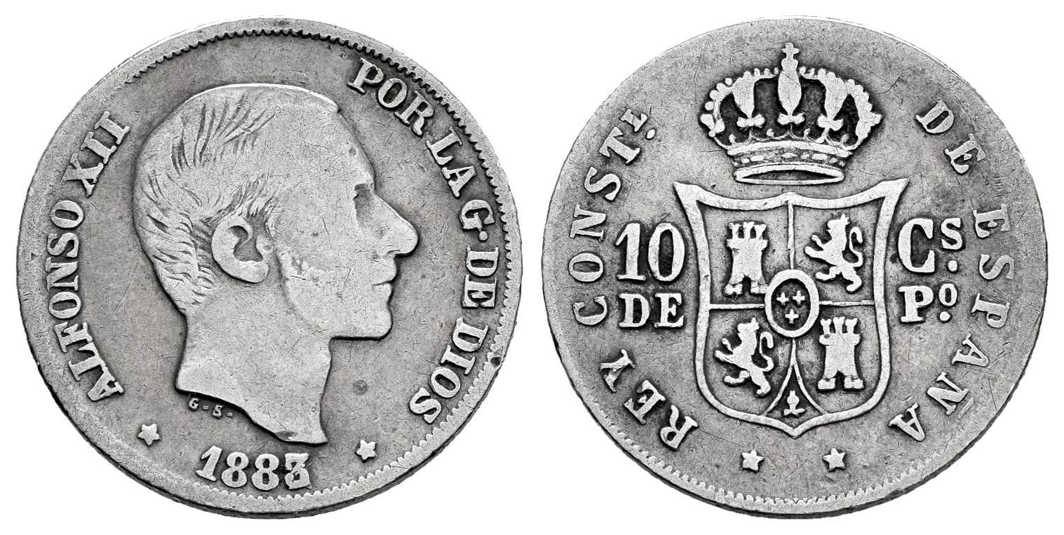 Centenario de la Peseta (1868-1931). Alfonso XII (1874-1885). 10 centavos. 1883/2. Manila. (Cal-98). Ag. 2,51 g. Sobrefecha. Rara. BC+. Est...110,00.