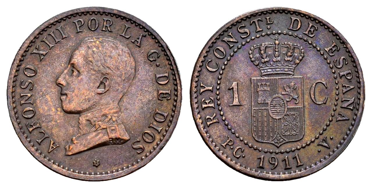 Centenario de la Peseta (1868-1931). Alfonso XIII (1886-1931). 1 céntimo. 1911*1. Madrid. PCV. (Cal-3). Ae. 1,03 g. Escasa. MBC+. Est...35,00.