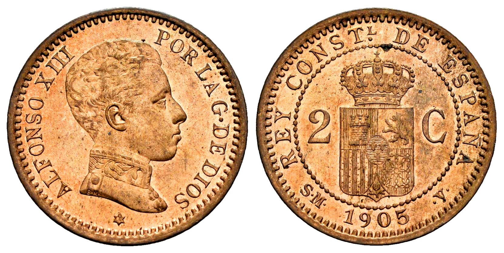 Centenario de la Peseta (1868-1931). Alfonso XIII (1886-1931). 2 céntimos. 1905*05. Madrid. SMV. (Cal-11). Ae. 2,12 g. SC-. Est...12,00.