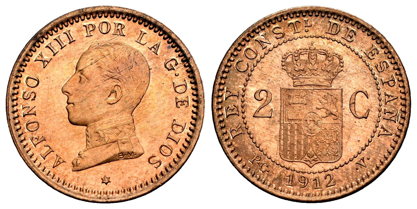 Centenario de la Peseta (1868-1931). Alfonso XIII (1886-1931). 2 céntimos. 1912*12. Madrid. PCV. (Cal-15). Ae. 2,10 g. SC. Est...12,00.