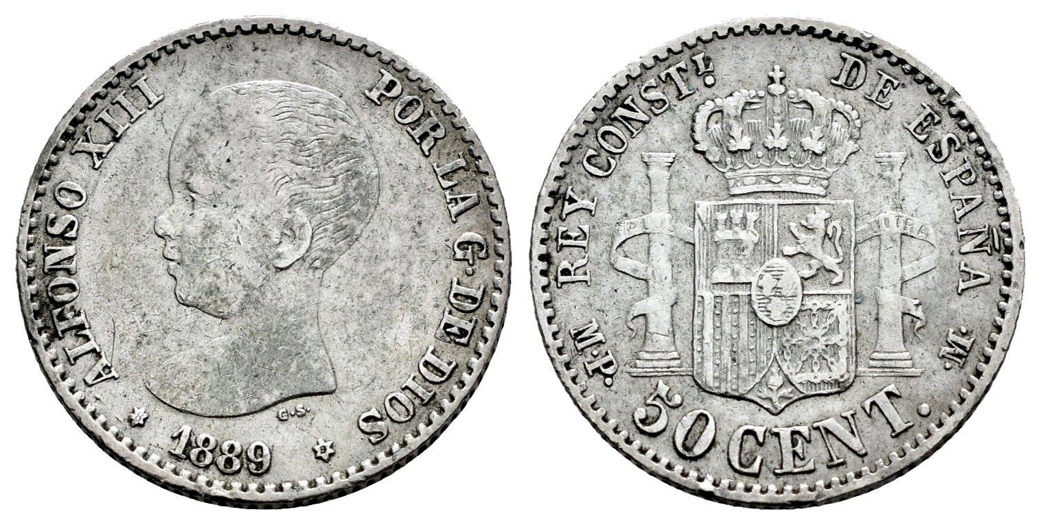 Centenario de la Peseta (1868-1931). Alfonso XII (1874-1885). 50 céntimos. 1889*8-9. Madrid. MPM. (Cal-27). Ag. 2,46 g. MBC. Est...30,00.