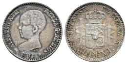 Centenario de la Peseta (1868-1931). Alfonso XIII (1886-1931). 50 céntimos. 1892*9-2. Madrid. PGM. (Cal-38). Ag. 2,48 g. MBC+. Est...40,00.