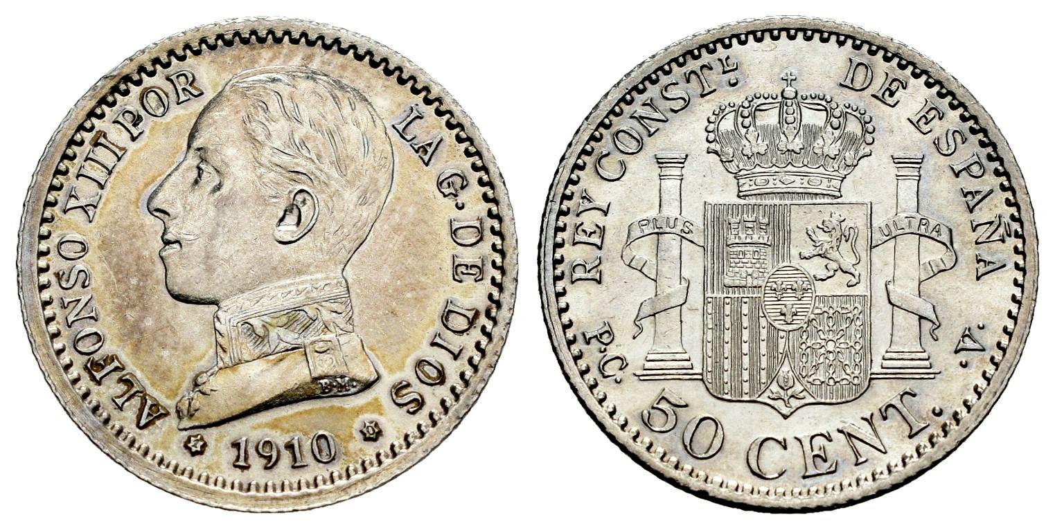 Centenario de la Peseta (1868-1931). Alfonso XIII (1886-1931). 50 céntimos. 1910*1-0. Madrid. PCV. (Cal-48). Ag. 2,49 g. Raya en anverso. Limpiada. EBC. Est...15,00.
