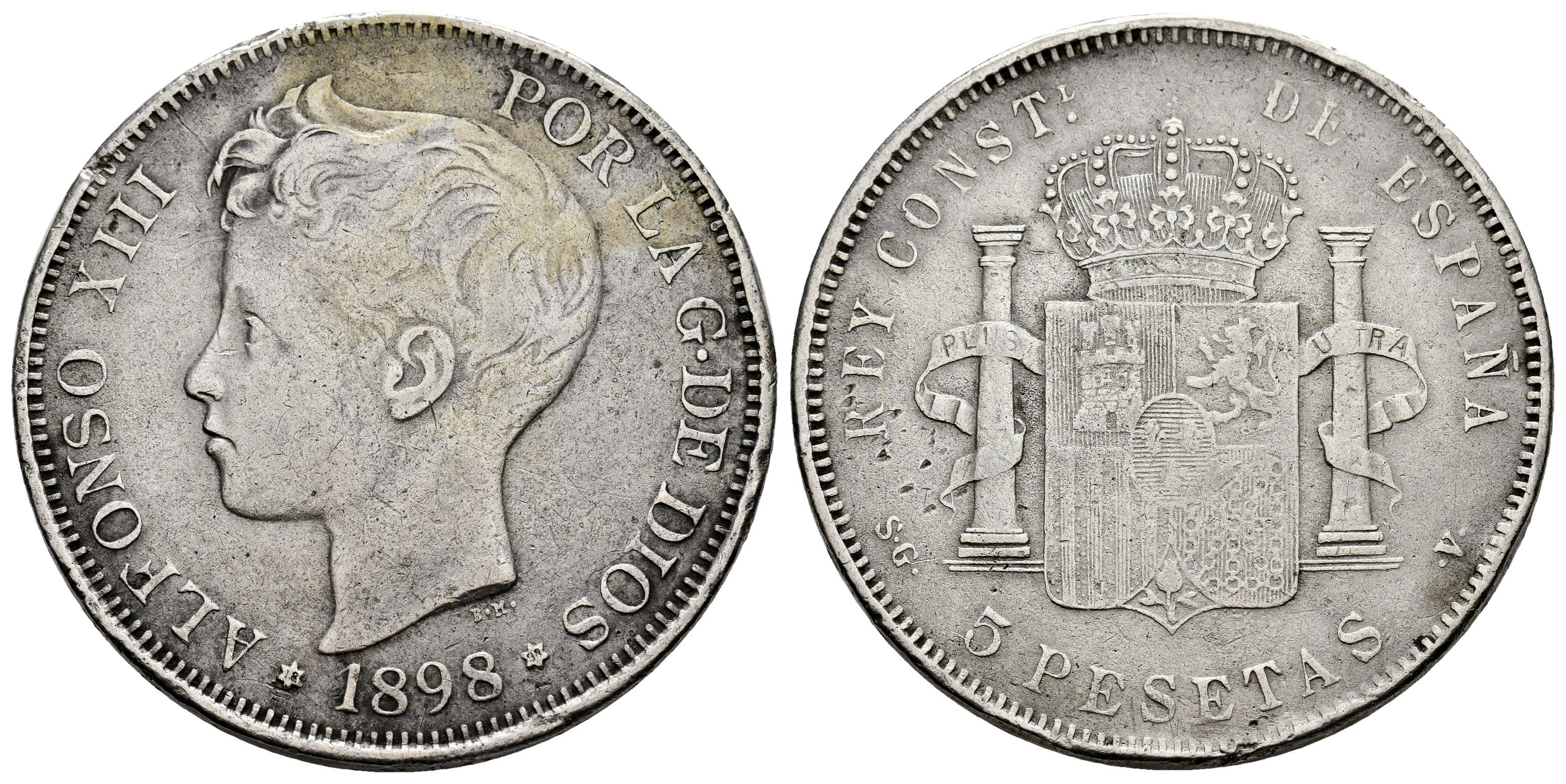 Centenario de la Peseta (1868-1931). Alfonso XIII (1886-1931). 5 pesetas. 1898*18-98. Madrid. SGV. (Cal-109 similar). Ag. 27,42 g. "Duro sevillano" falso de época coincidente. Golpes en canto. MBC-. Est...35,00.