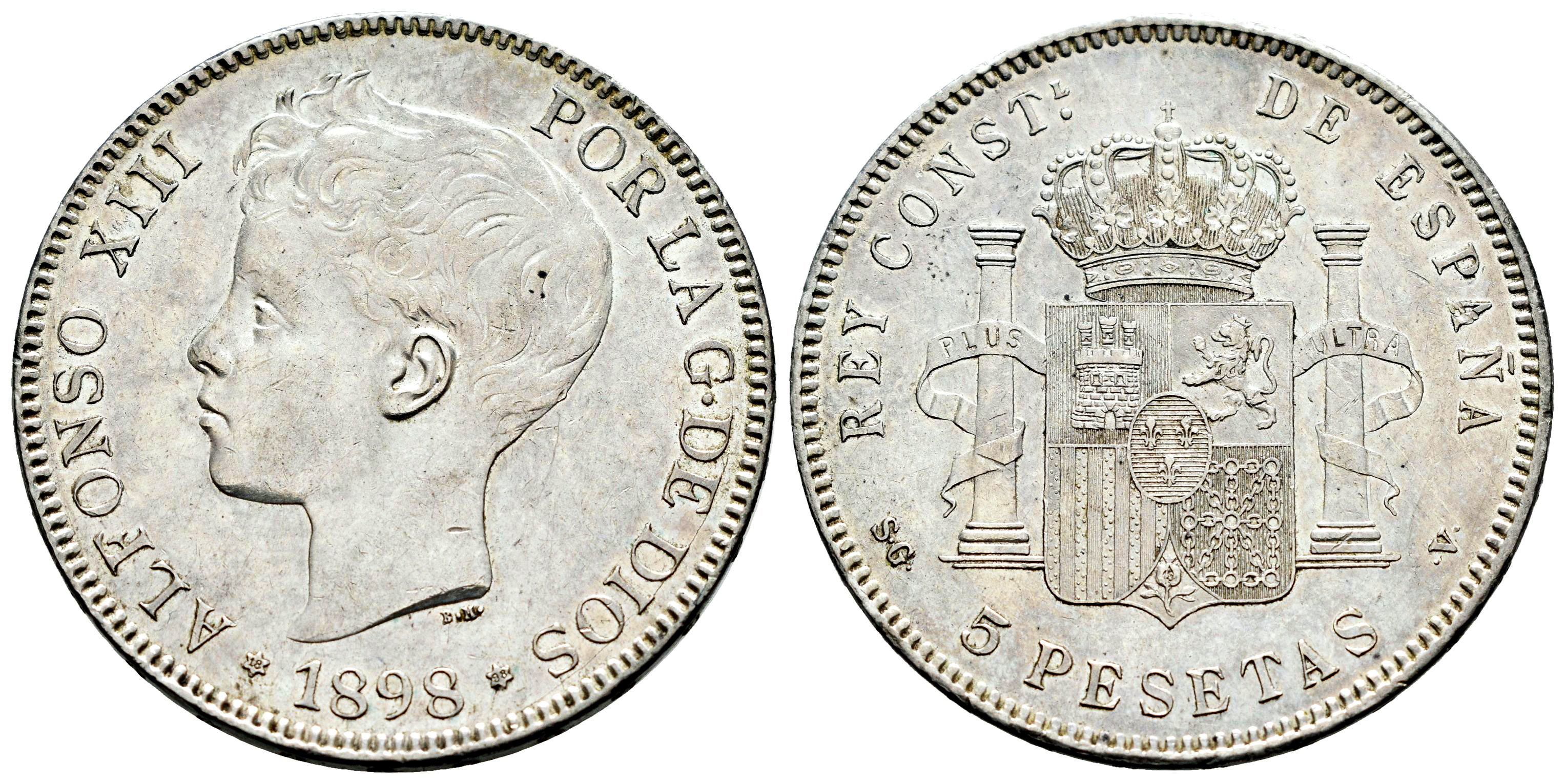 Centenario de la Peseta (1868-1931). Alfonso XIII (1886-1931). 5 pesetas. 1898*18-98. Madrid. SGV. (Cal-109). Ag. 25,30 g. Golpecitos. EBC-. Est...35,00.