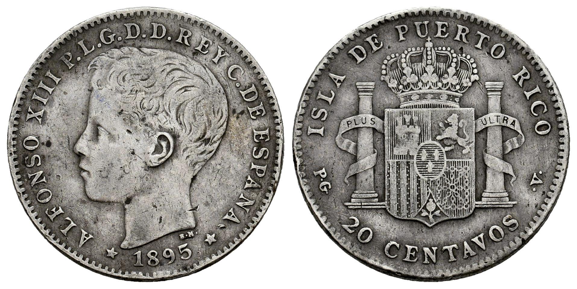 Centenario de la Peseta (1868-1931). Alfonso XIII (1886-1931). 20 centavos. 1895. Puerto Rico. PGV. (Cal-126). Ag. 4,96 g. Golpes. MBC-. Est...90,00.