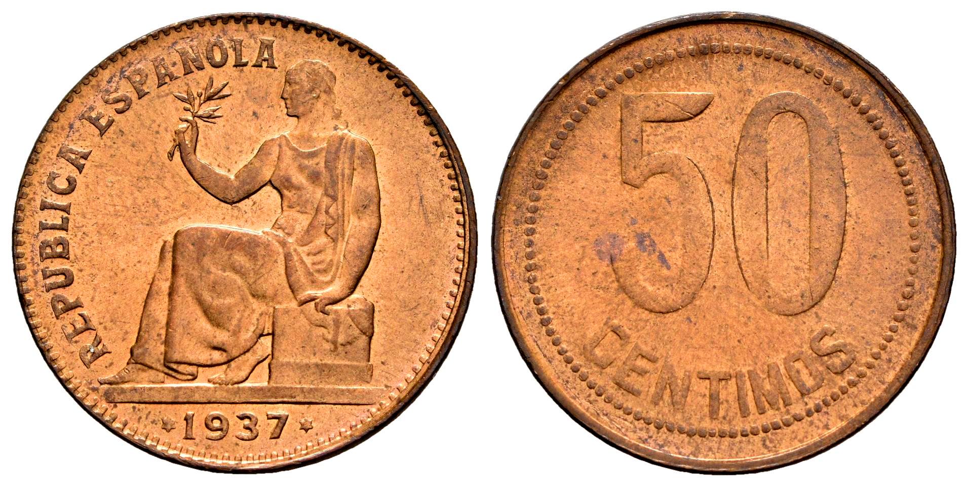 II República (1931-1939). 50 céntimos. 1937. Madrid. (Cal-29). Ae. 6,00 g. Brillo original. SC. Est...40,00.