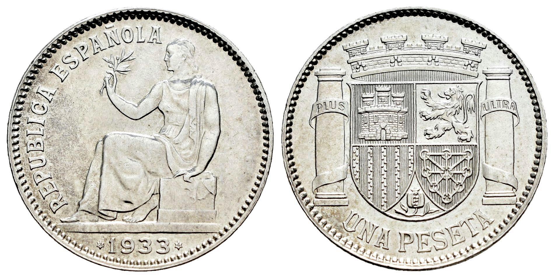 II República (1931-1939). 1 peseta. 1933*34. Madrid. (Cal-34). Ag. 4,46 g. Suaves rayitas en anverso. Brillo original. EBC+/SC-. Est...30,00.