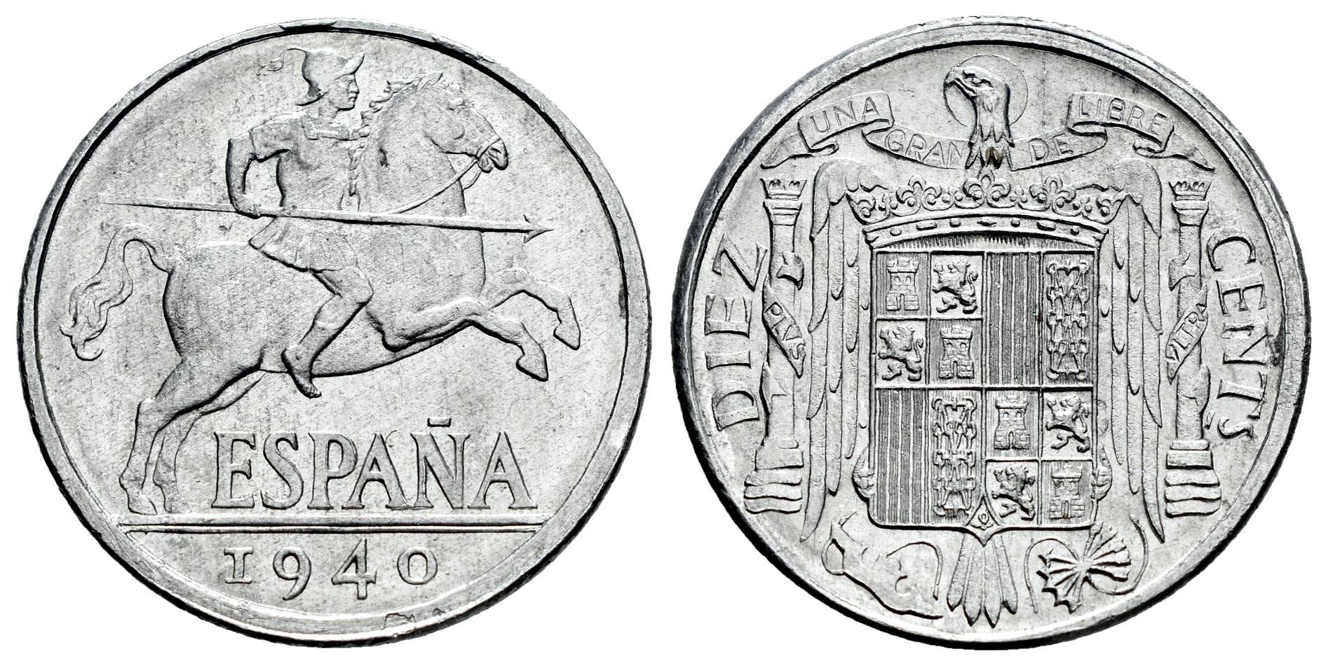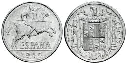 Estado Español (1936-1975). 10 céntimos. 1940. Madrid. (Cal-6). Al. 1,86 g. PLVS. Escasa. SC. Est...90,00.
