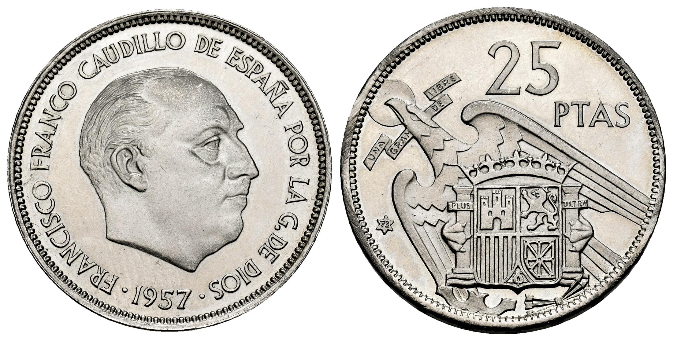Estado Español (1936-1975). 25 pesetas. 1957*73. Madrid. (Cal-128). Ni. 8,45 g. Proviene de cartera FNMT. Pleno brillo original. SC. Est...40,00.