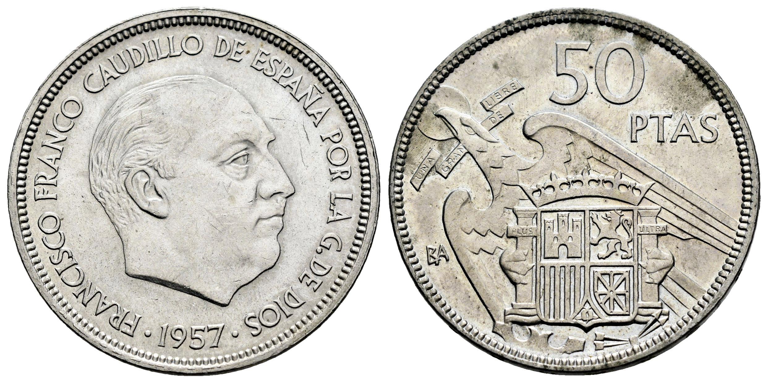 Estado Español (1936-1975). 50 pesetas. 1957. Barcelona. BA. (Cal-156). Ni. 12,56 g. Rayitas en anverso. SC-. Est...45,00.