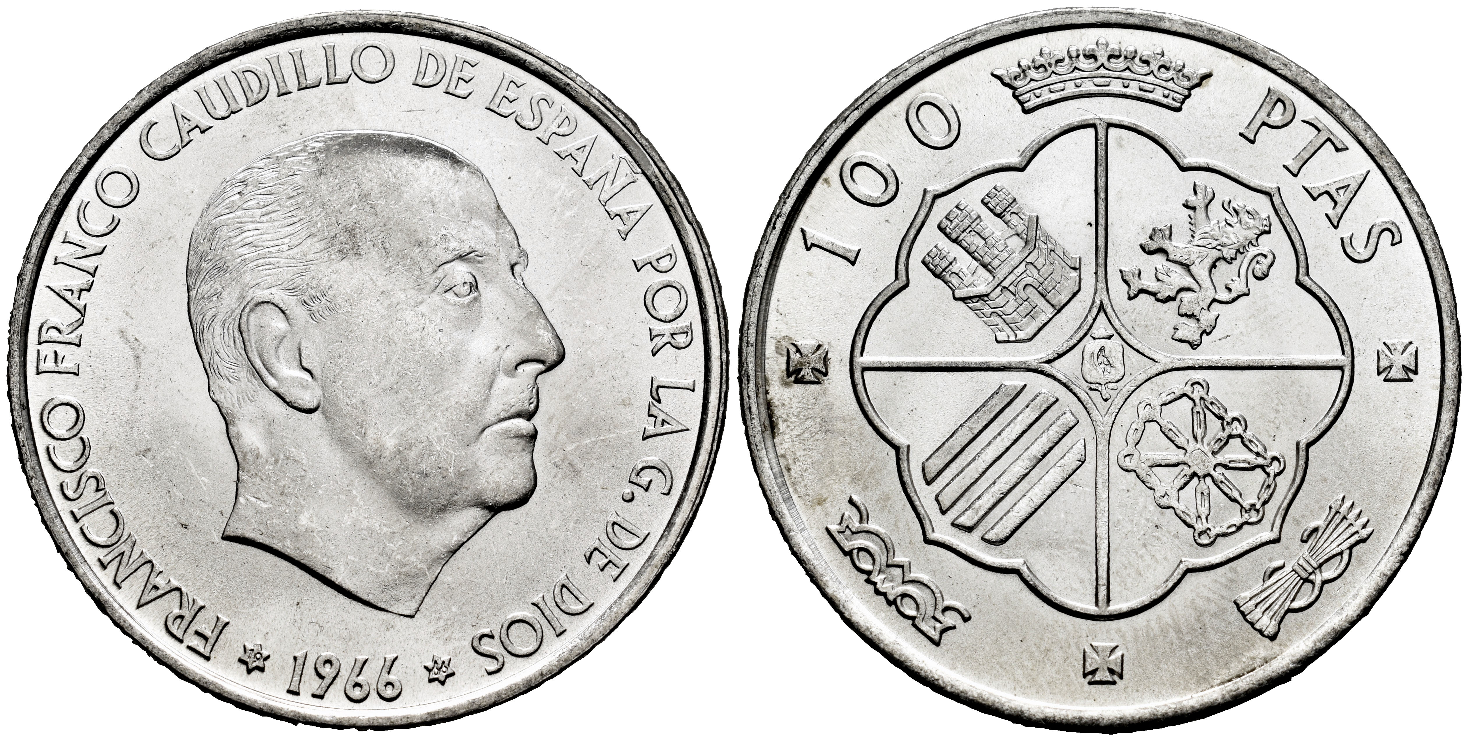 Estado Español (1936-1975). 100 pesetas. 1966*19-66. Madrid. (Cal-145). Ag. 18,97 g. Pleno brillo original. SC-/SC. Est...25,00.