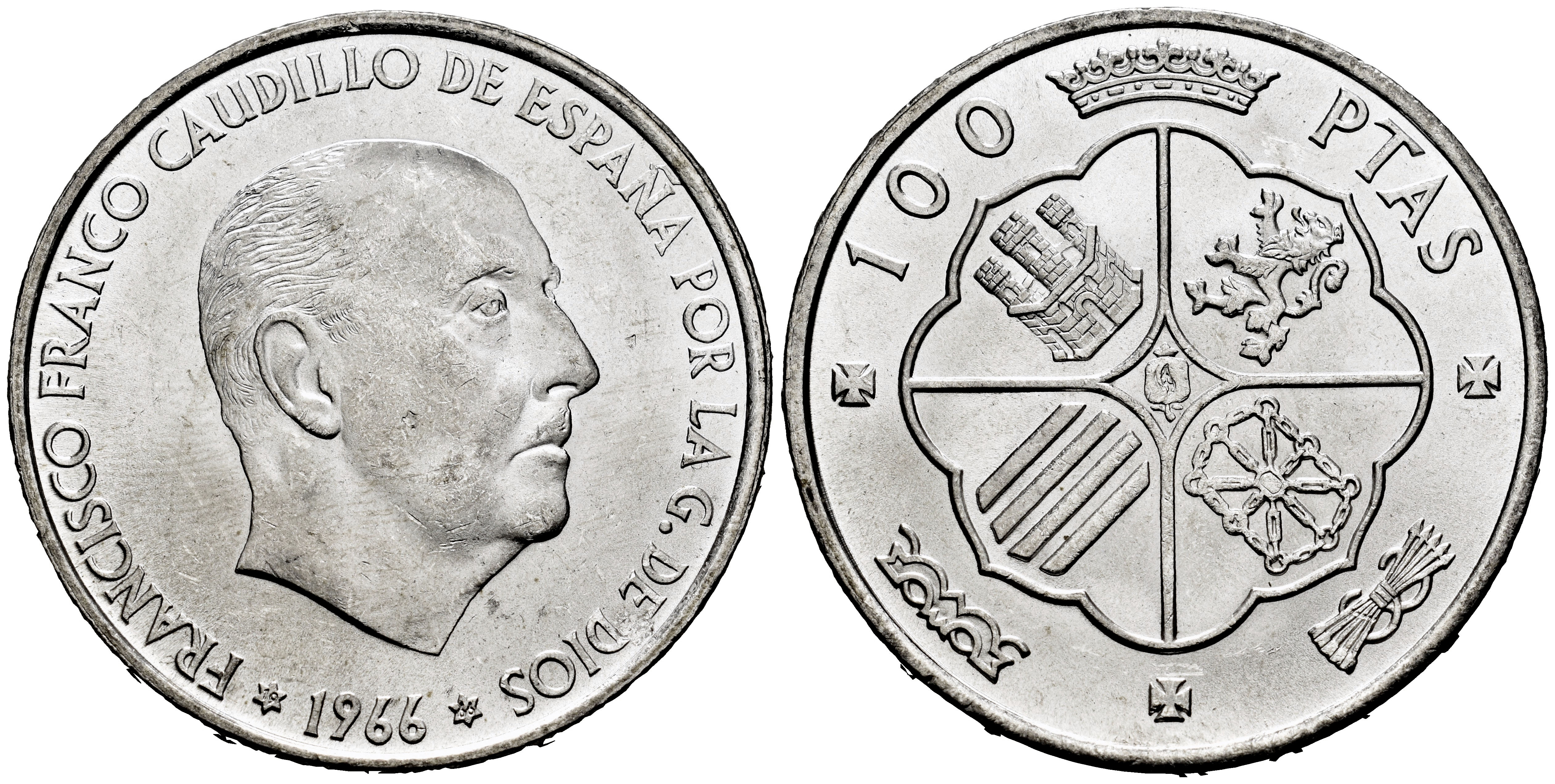 Estado Español (1936-1975). 100 pesetas. 1966*19-66. Madrid. (Cal-145). Ag. 18,93 g. Pleno brillo original. SC-/SC. Est...25,00.