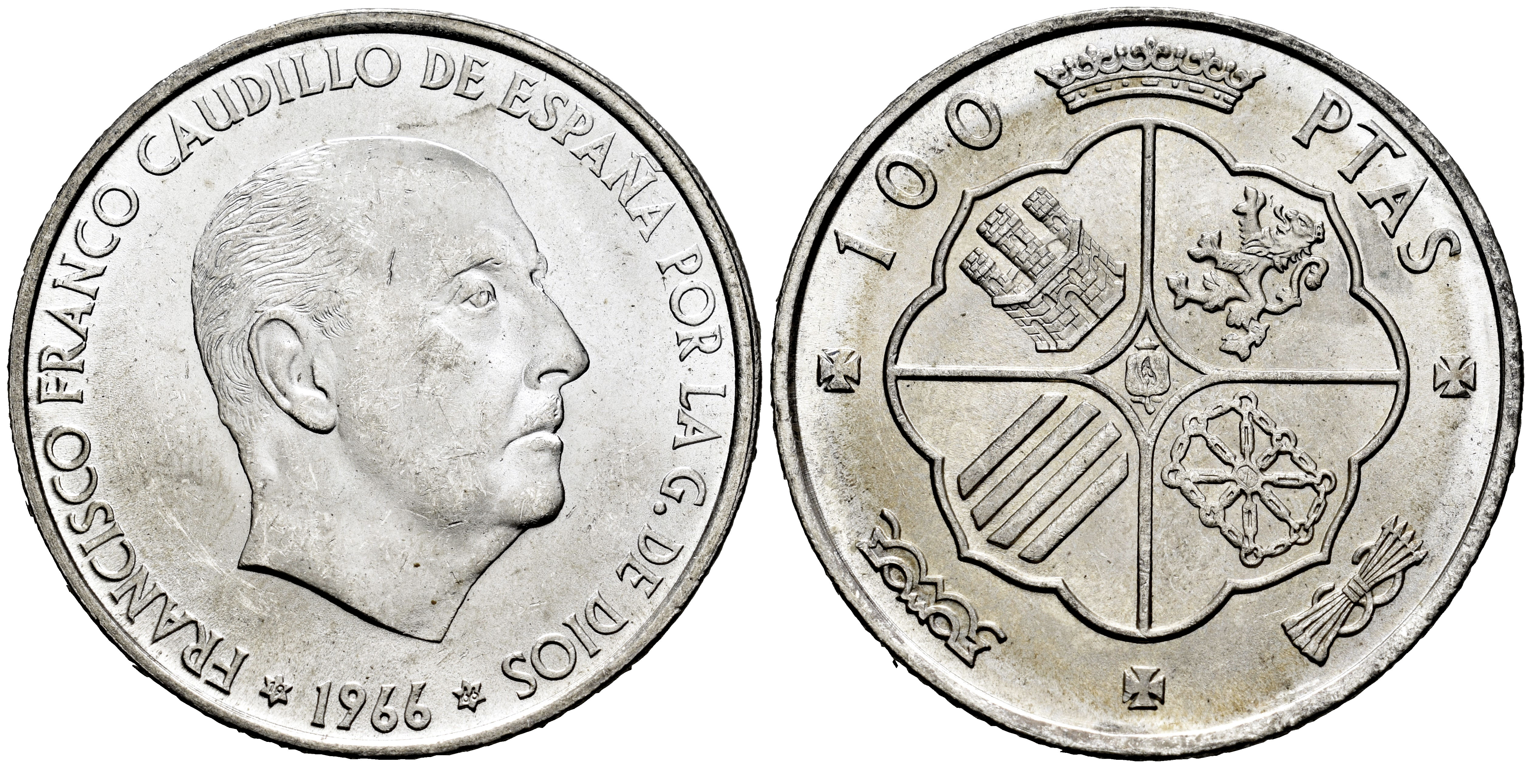 Estado Español (1936-1975). 100 pesetas. 1966*19-66. Madrid. (Cal-145). Ag. 19,15 g. Pleno brillo original. SC. Est...25,00.