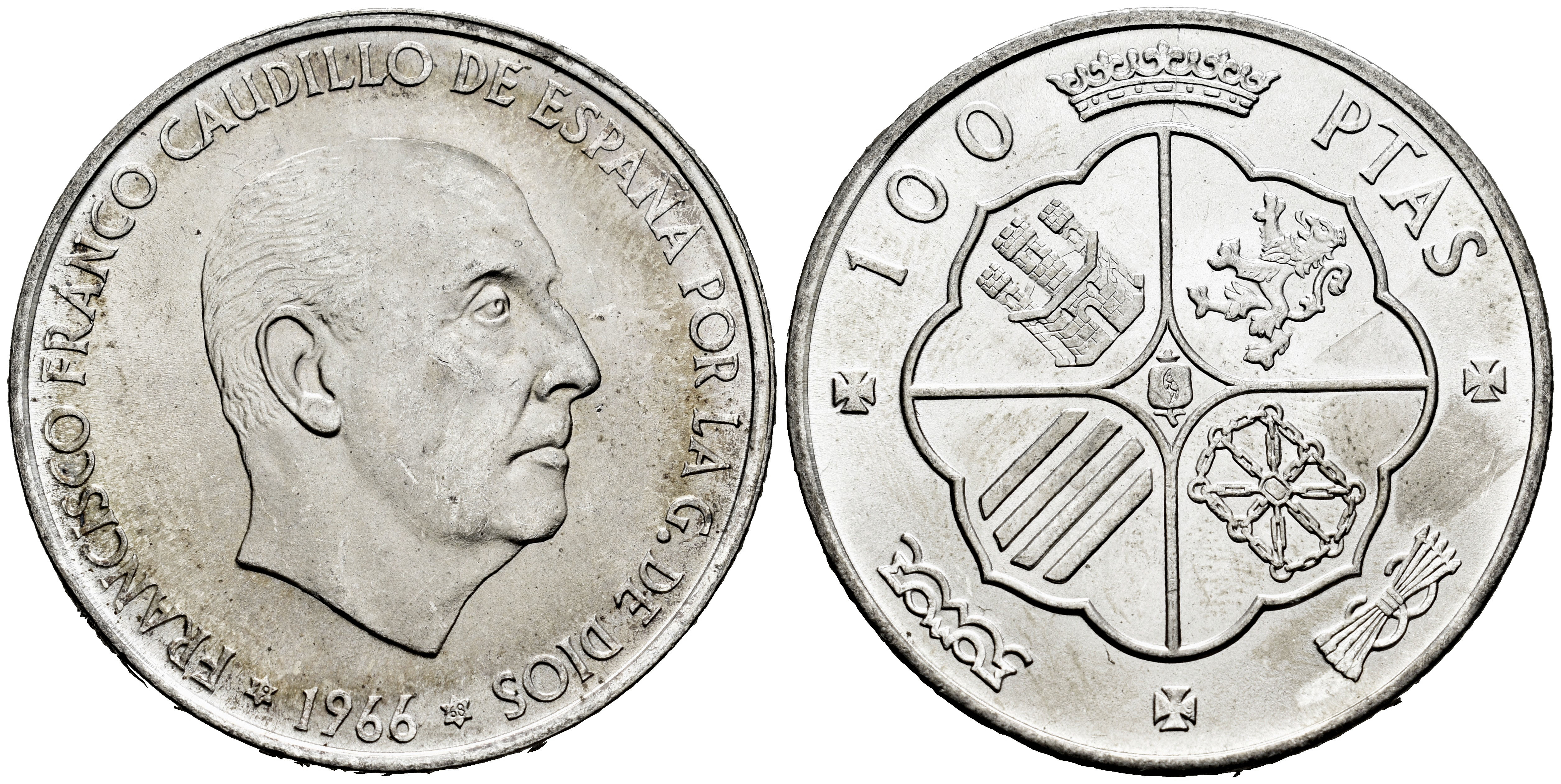 Estado Español (1936-1975). 100 pesetas. 1966*19-68. Madrid. (Cal-147). Ag. 19,21 g. Brillo original. EBC+/SC-. Est...25,00.