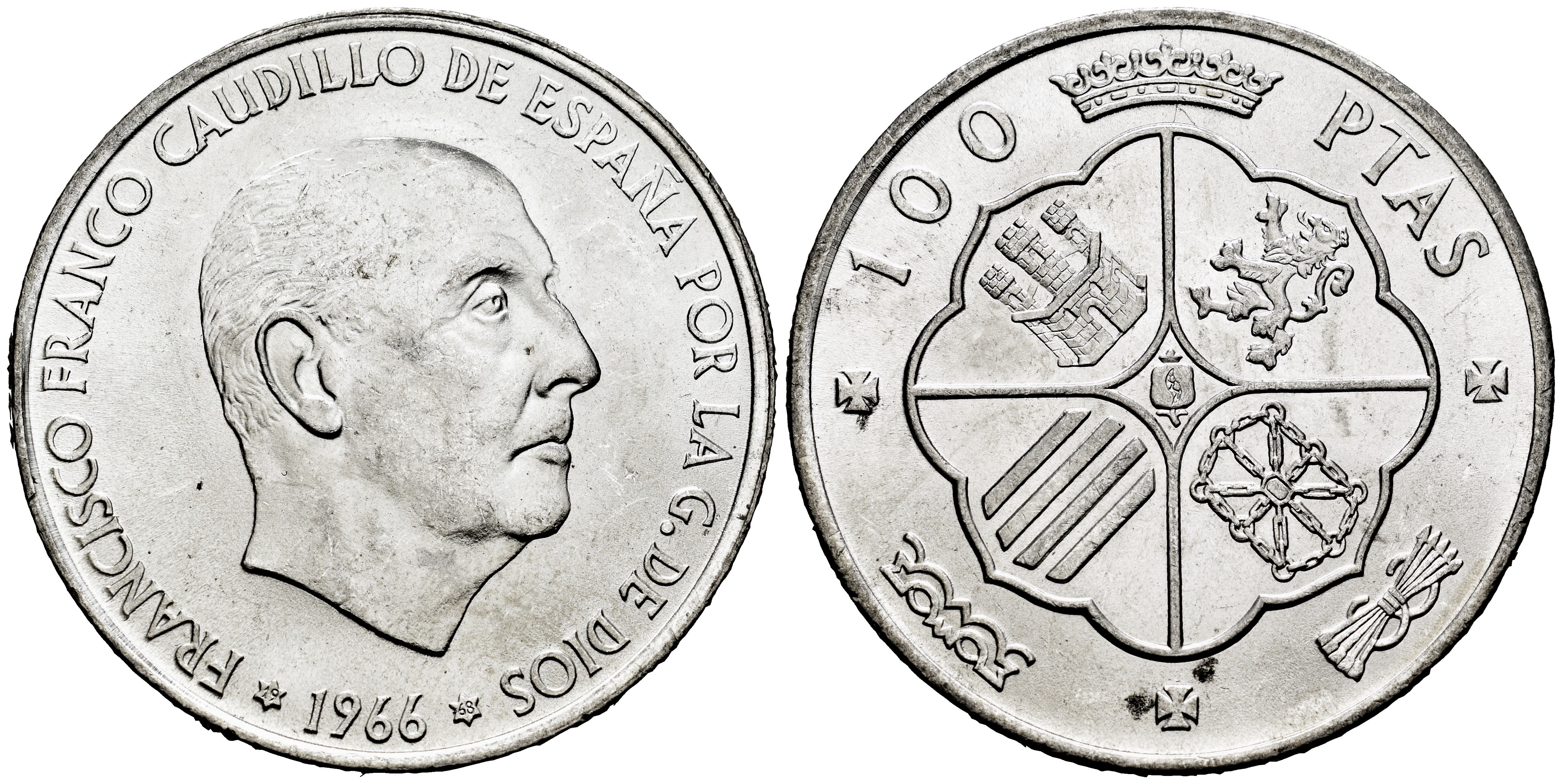 Estado Español (1936-1975). 100 pesetas. 1966*19-68. Madrid. (Cal-147). Ag. 19,10 g. Pleno brillo original. SC. Est...25,00.