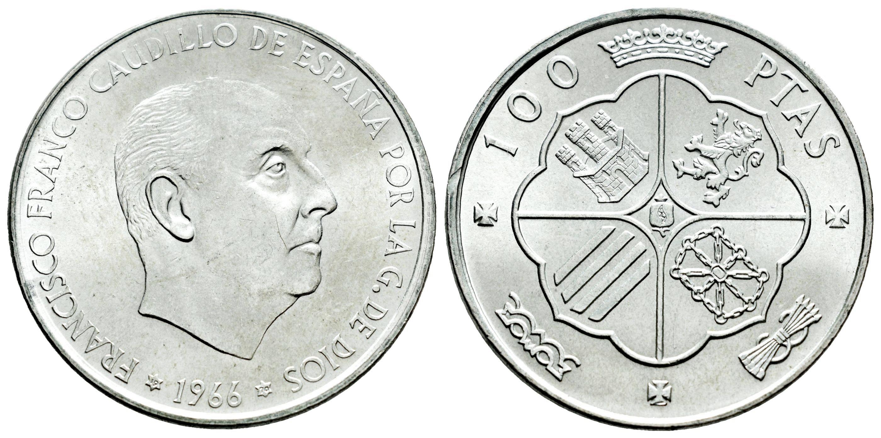 Estado Español (1936-1975). 100 pesetas. 1966*19-70. Madrid. (Cal-150). Ag. 19,41 g. Pleno brillo original. SC. Est...15,00.