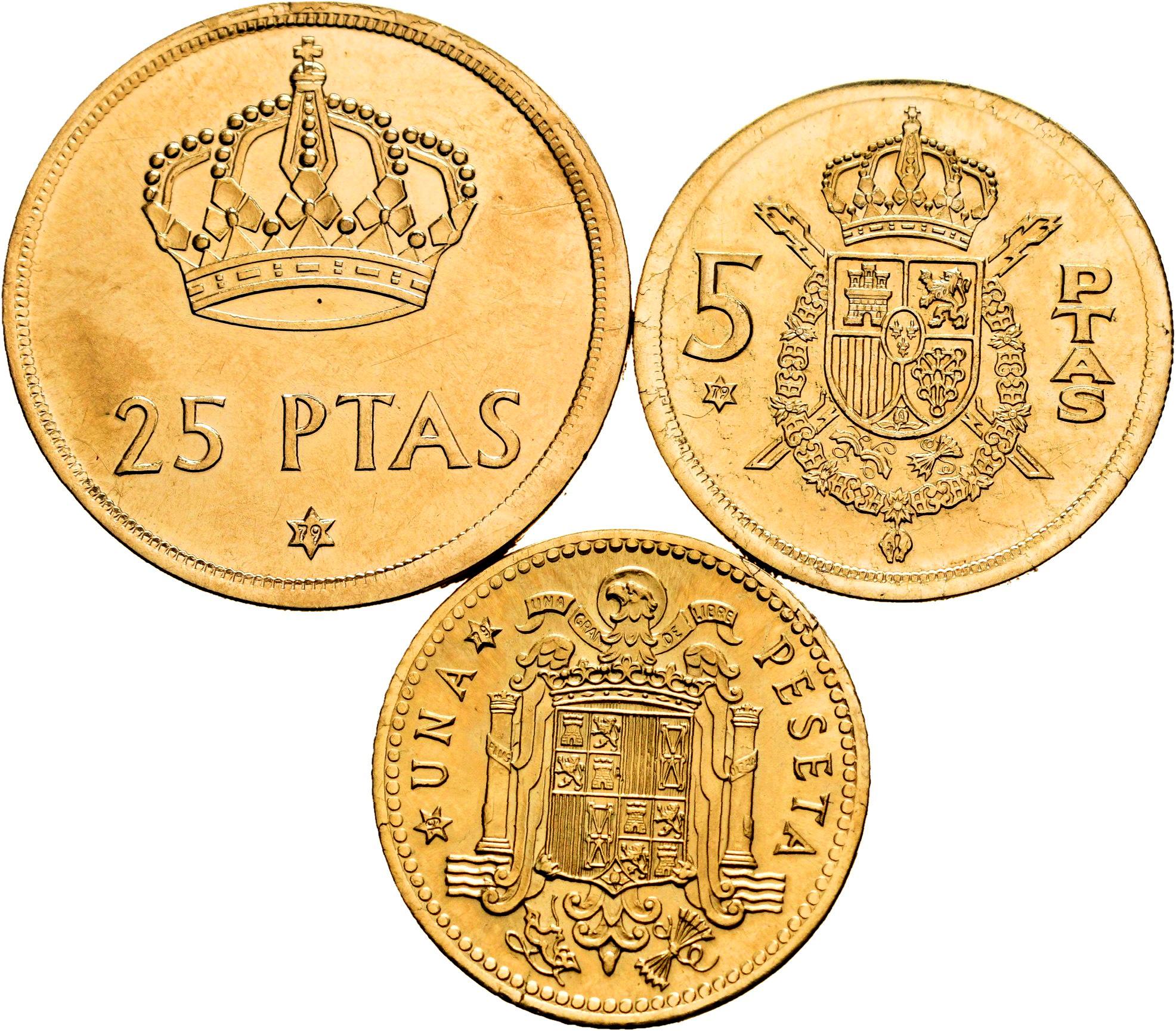Juan Carlos I (1975-2014). Serie 3 monedas 1, 5 y 25 Pesetas. 1975 *79. Madrid. Au. 31,64 g. Pruebas en oro. SC. Est...2500,00.