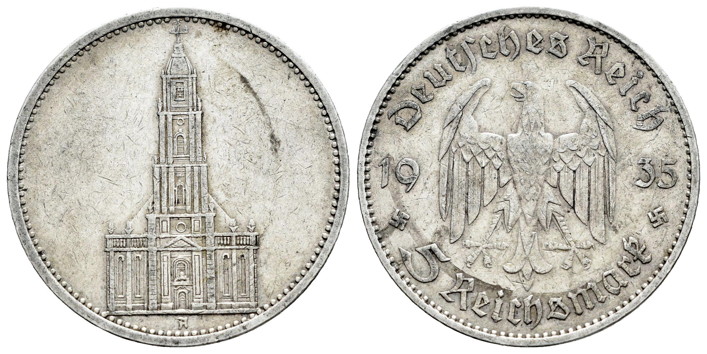 Alemania. Third Reich. 5 reichsmark. 1935. Berlín. A. (Km-83). (Jaeger-357). Ag. 13,74 g. 1er aniversario del régimen nazi- - Potsdam Garrison Church. Marquitas. MBC+/MBC. Est...25,00.