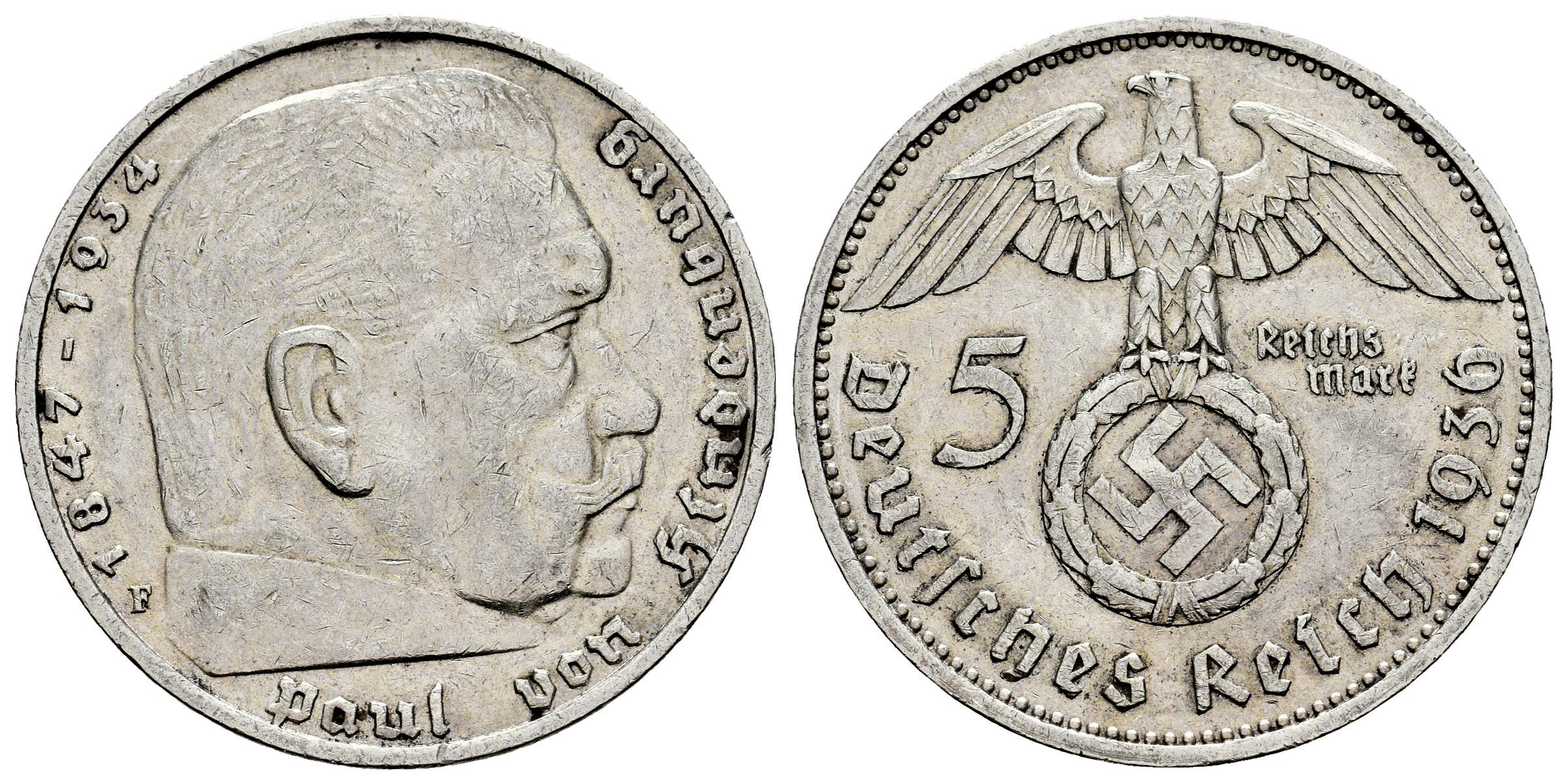 Alemania. Third Reich. 5 reichsmark. 1936. Stuttgart. F. (Km-94). Ag. 13,86 g. Marquitas. Limpiada. EBC-. Est...25,00.