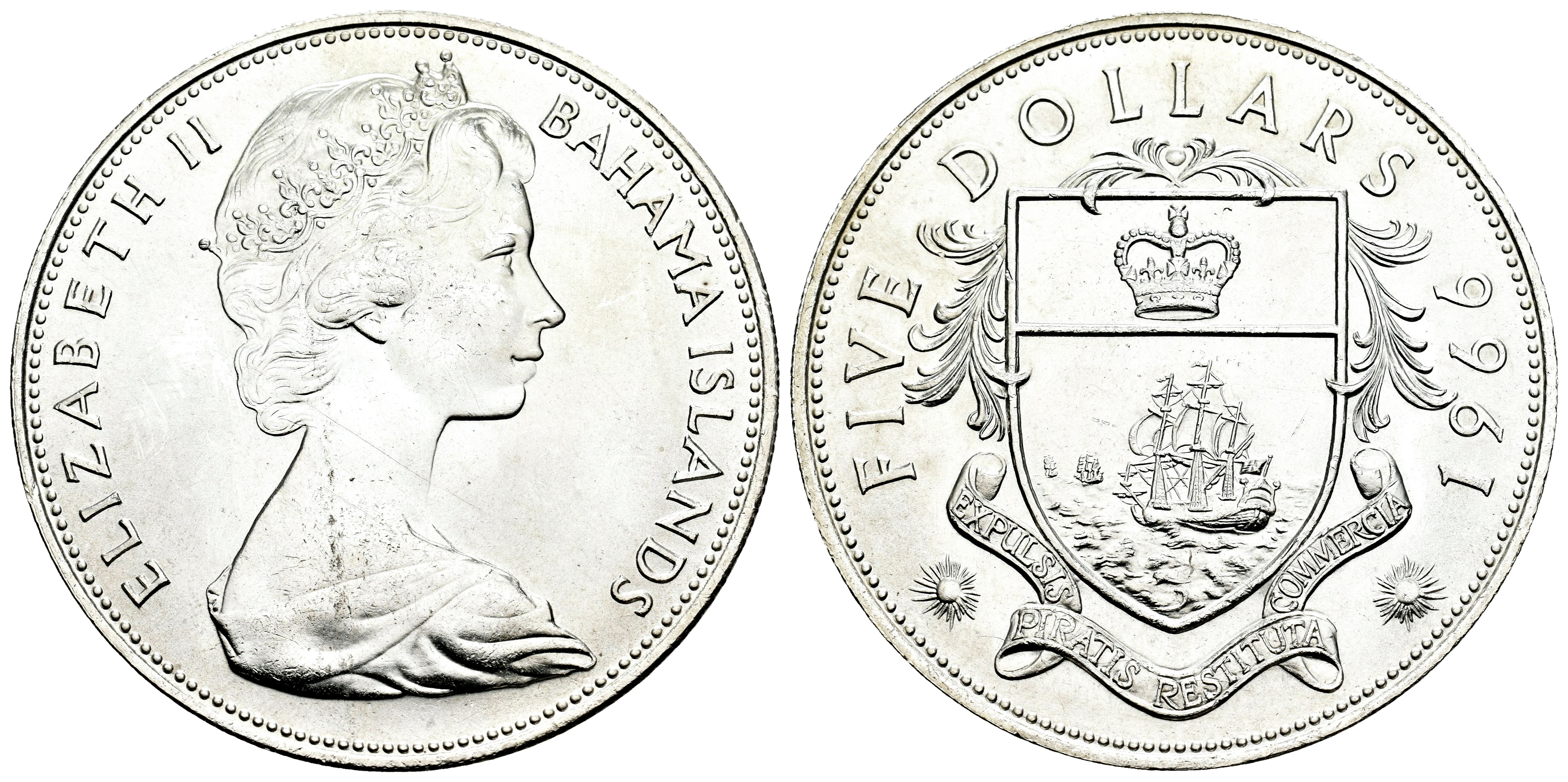 Bahamas. Elizabeth II. 5 dollars. 1966. Londres. (Km-10). Ag. 42,24 g. Pleno brillo original. SC. Est...50,00.