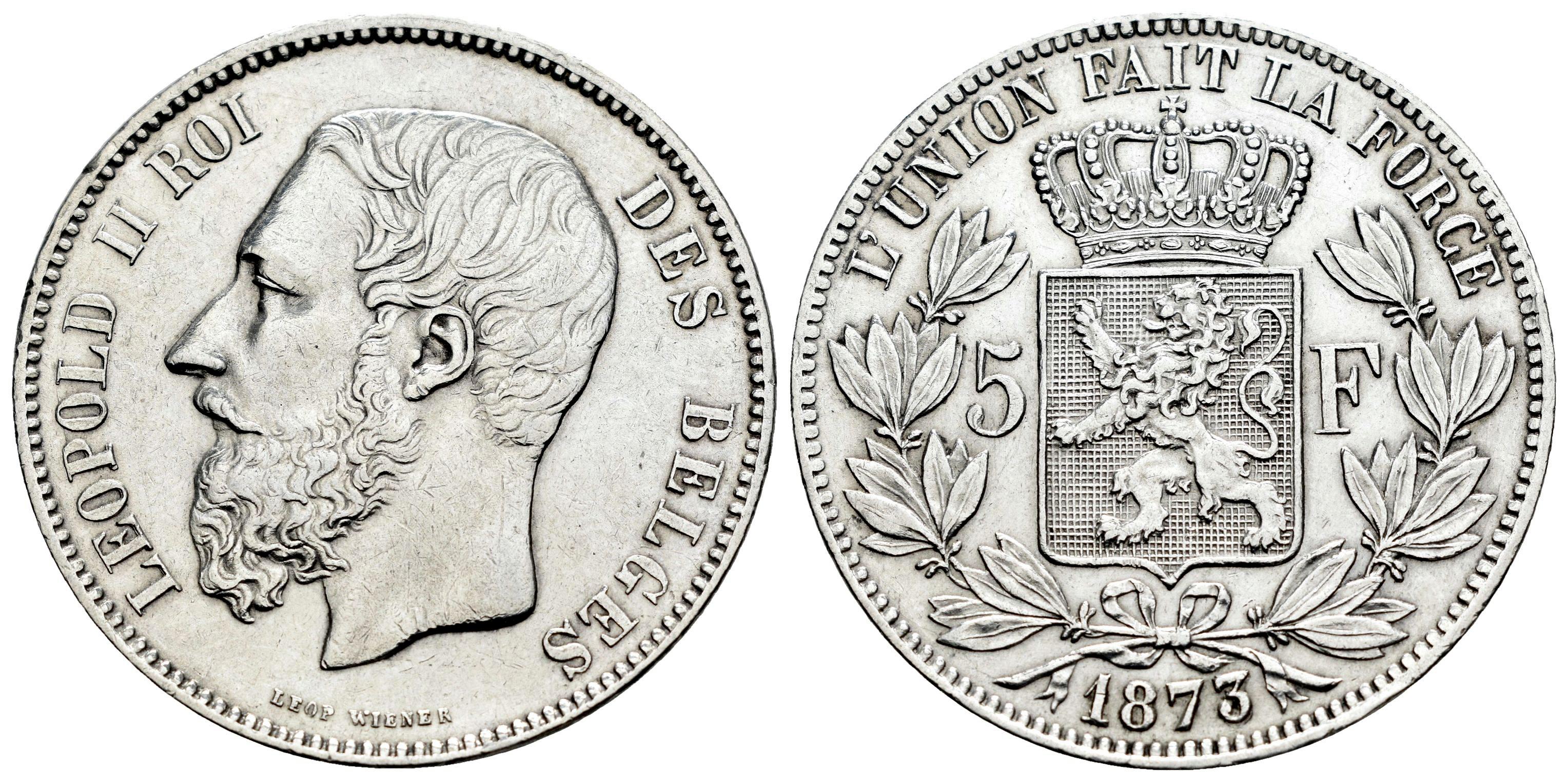 Bélgica. Leopoldo II (1865-1909). 5 francs. 1873. Bruselas. (Km-24). (Mor-160). Ag. 24,97 g. Limpiada. MBC+. Est...40,00.