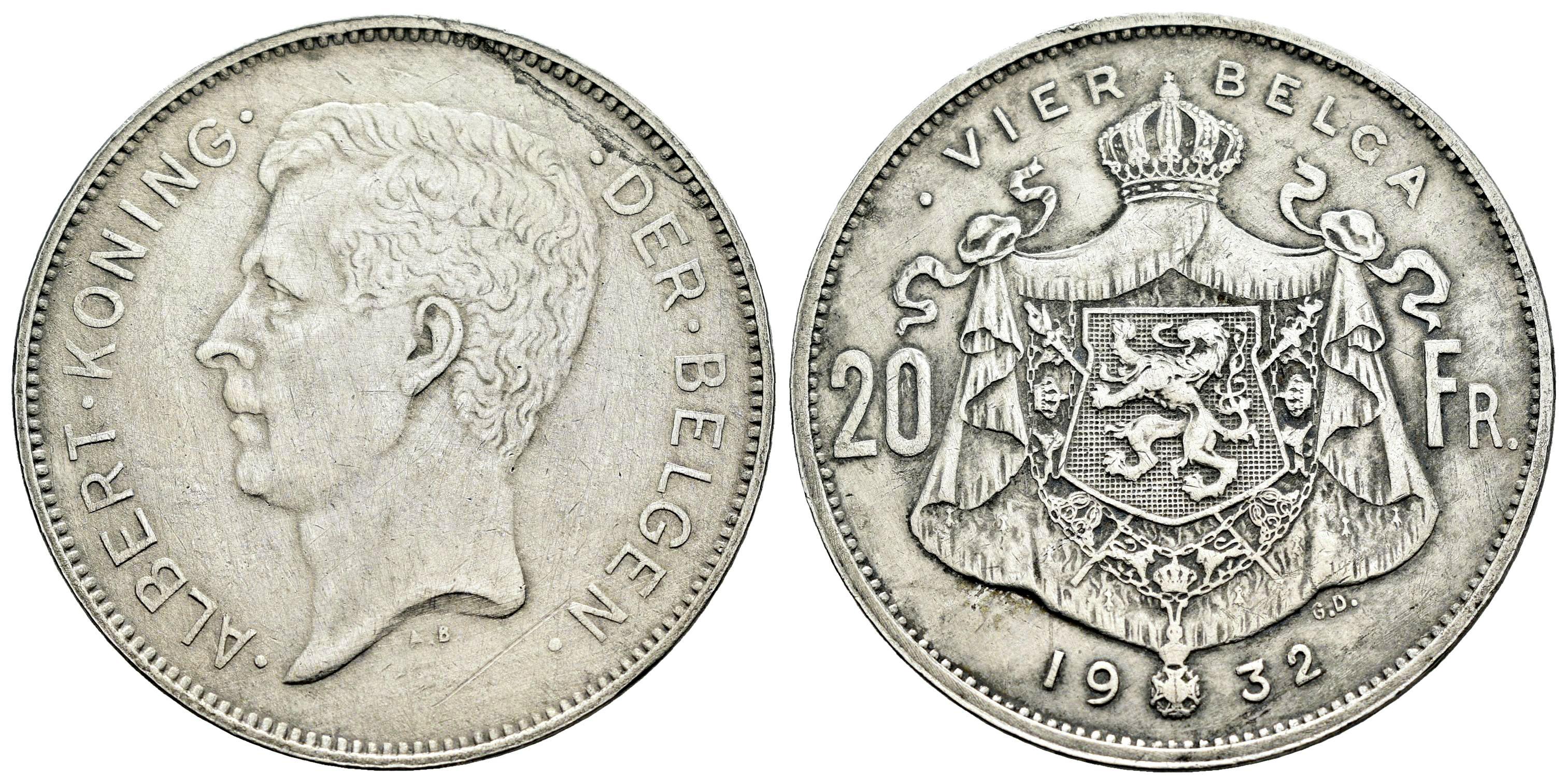Bélgica. Albert I. 20 francs. 1932. Bruselas. (Km-102). Ni. 19,98 g. Fuertemente limpiada. MBC-. Est...20,00.