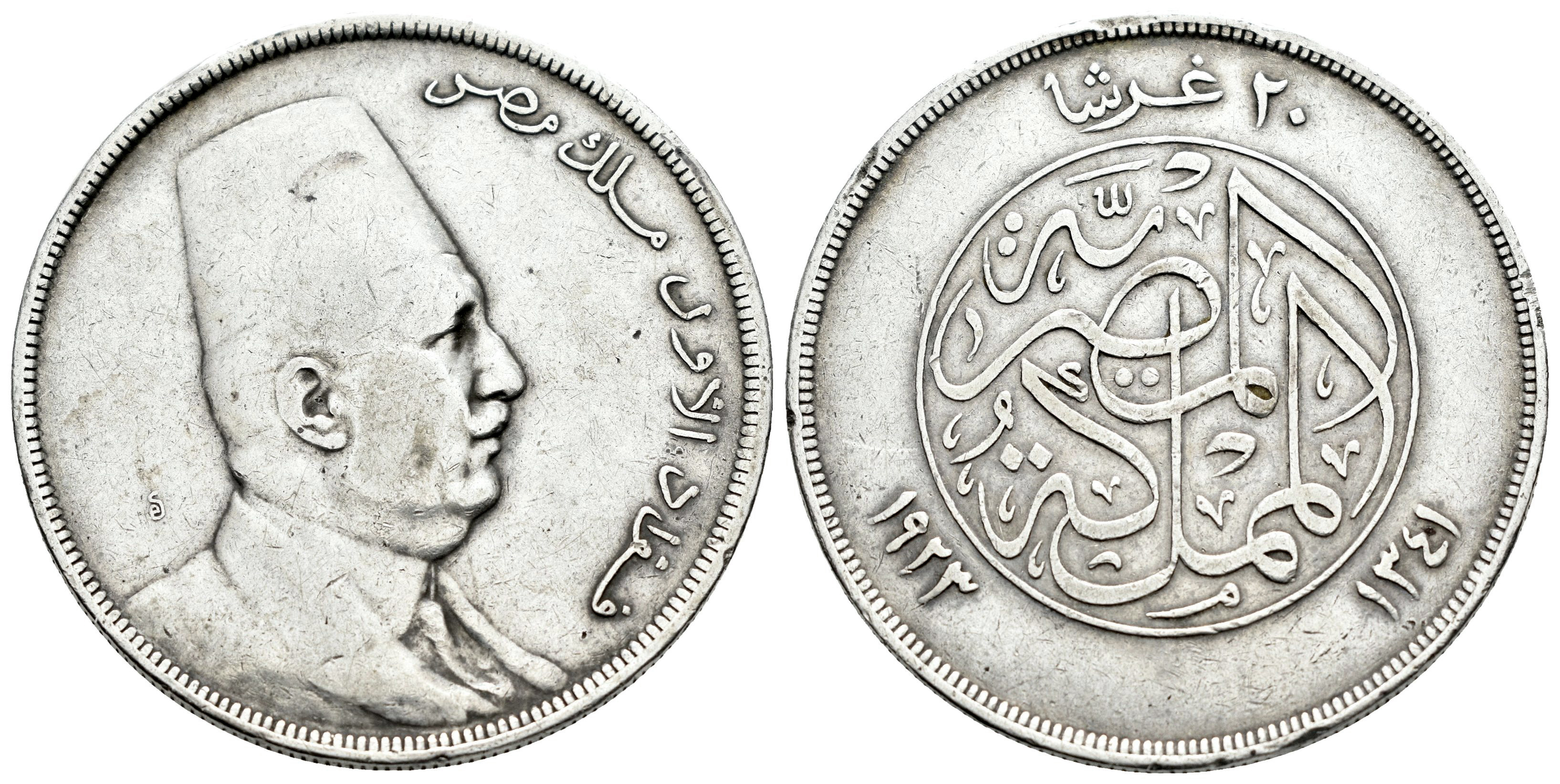Egipto. Ahmed Fuad I (1922-1936). 20 piastres. 1923 H. (Km-338). (Km-338). Ag. 27,81 g. Golpes en el canto. Escasa. MBC. Est...45,00.
