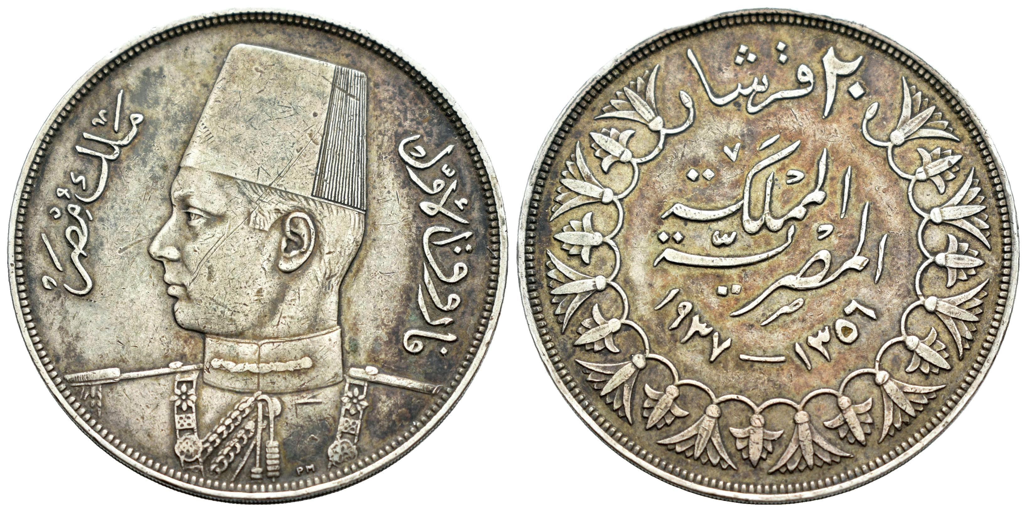 Egipto. Farouk I (1936-1952). 20 piastres. 1356 H (1937). (Km-368). Ag. 27,94 g. Golpes en el canto. Pátina. MBC+. Est...60,00.