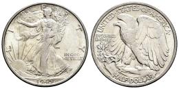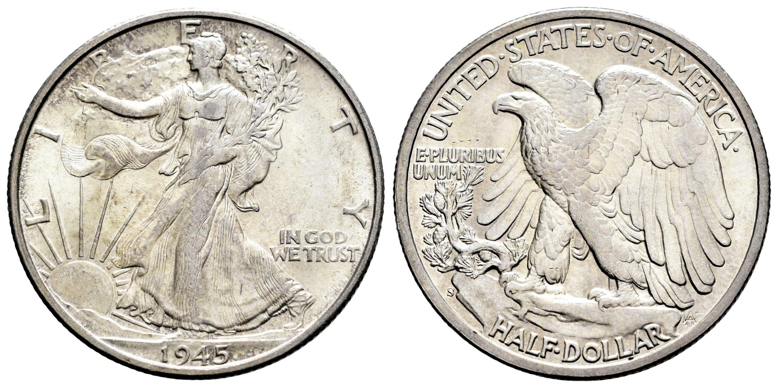 Estados Unidos. Walking Liberty Dollars. 1/2 dollar. 1945. San Francisco. S. (Km-142). Ag. 12,54 g. Tono. Brillo original. EBC+. Est...30,00.