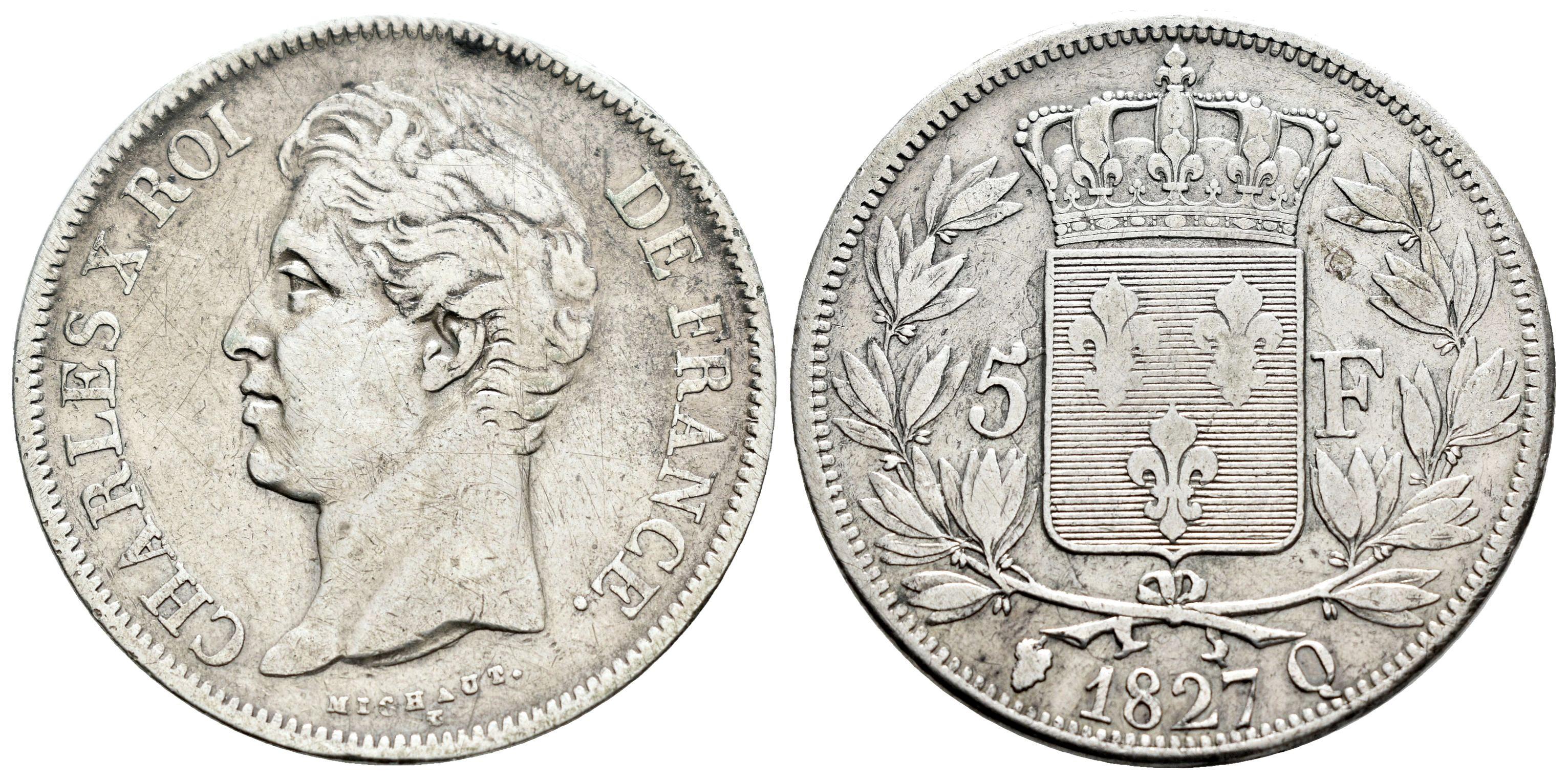 Francia. Charles X. 5 francs. 1827. Perpignan. Q. (Km-728.11). (Gad-644). Ag. 24,67 g. Limpiada. MBC-. Est...50,00.
