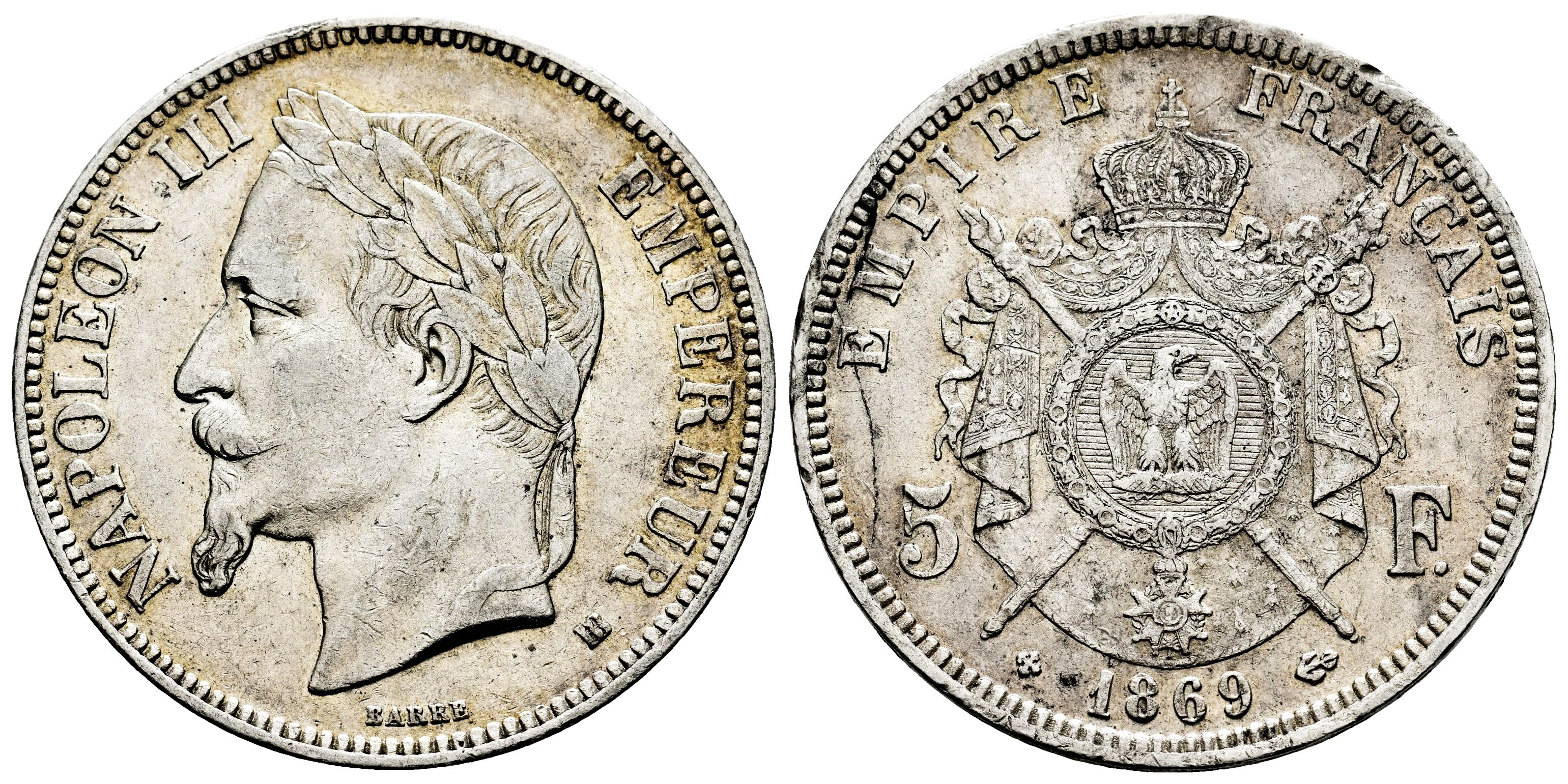 Francia. Napoleón III. 5 francs. 1869. Estrasburgo. BB. (Km-799.2). (Gad-739). Ag. 25,07 g. Ligero tono. EBC-. Est...50,00.
