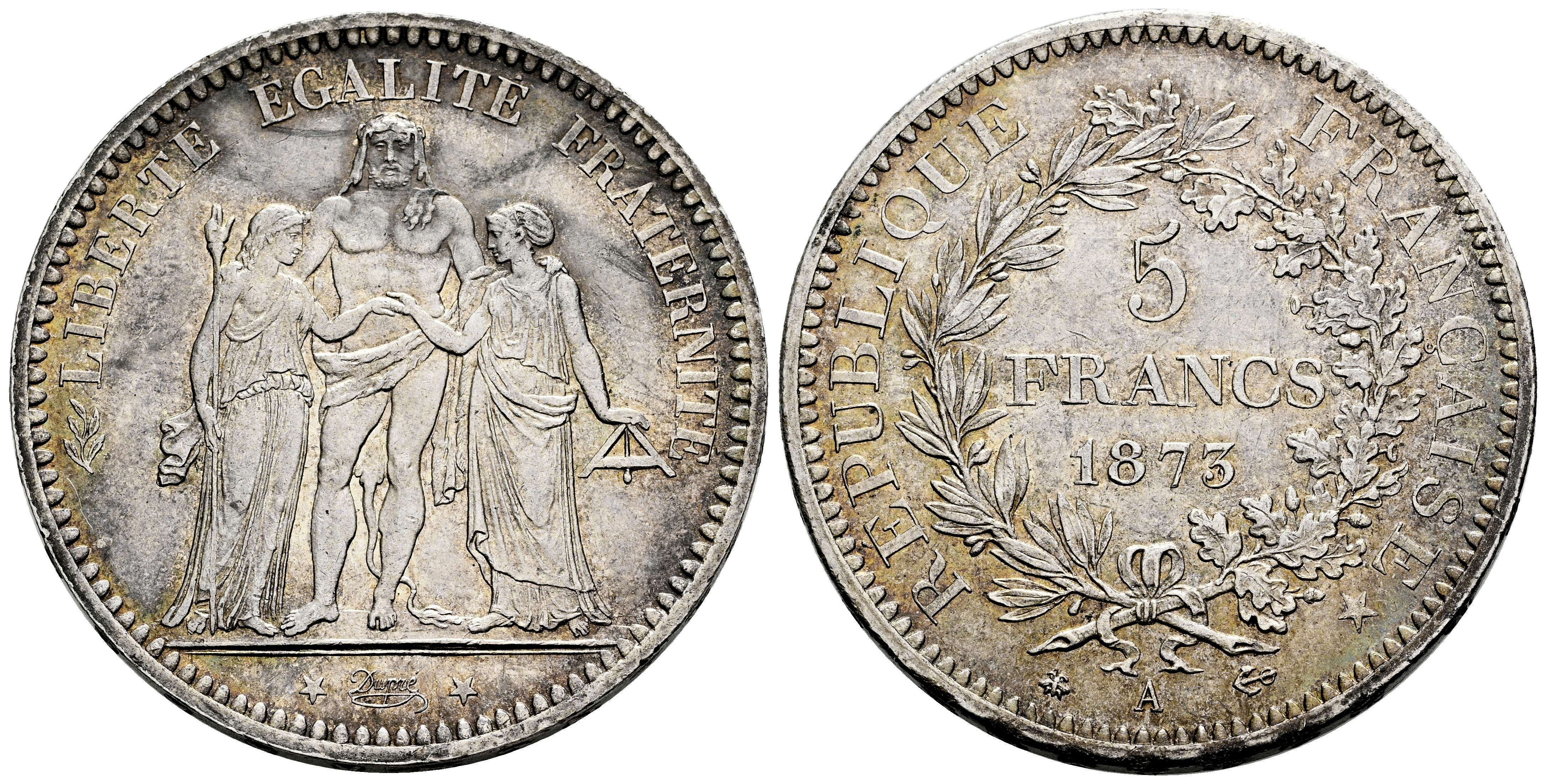 Francia. 5 francs. 1873. París. A. (Km-820.1). (Gad-745a). Ag. 25,03 g. Leves restos de brillo original. Ligero tono. EBC+/EBC. Est...50,00.